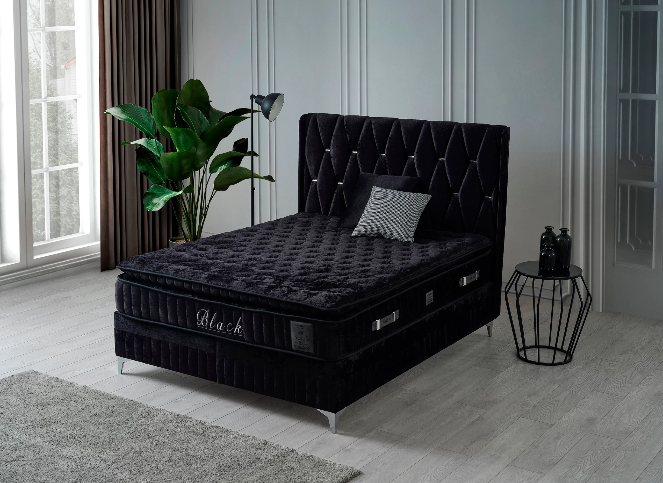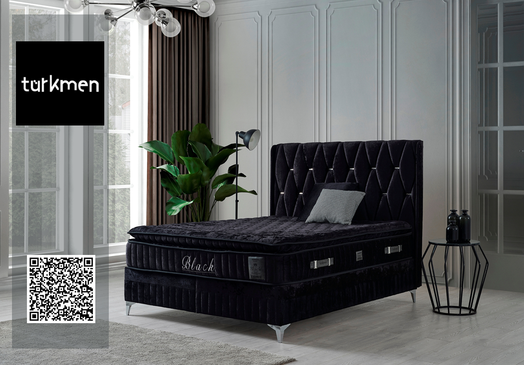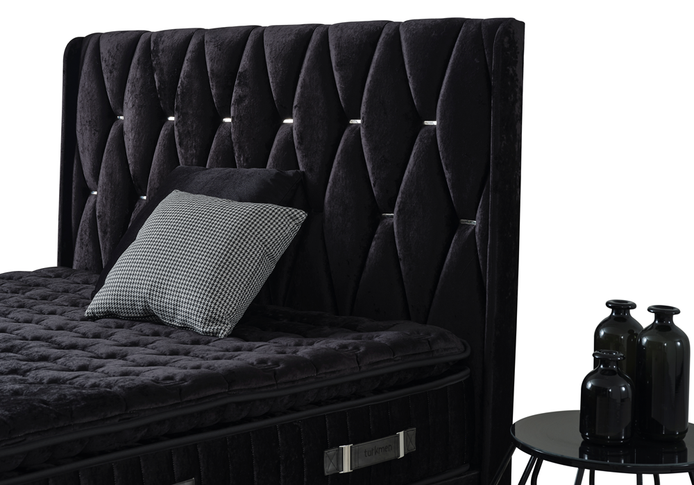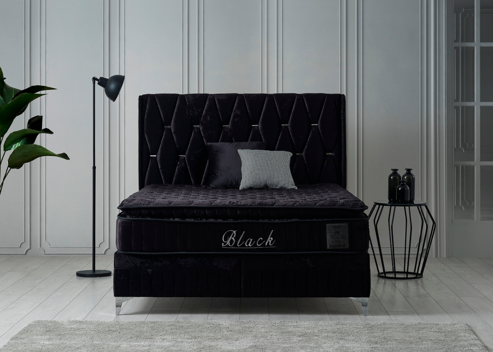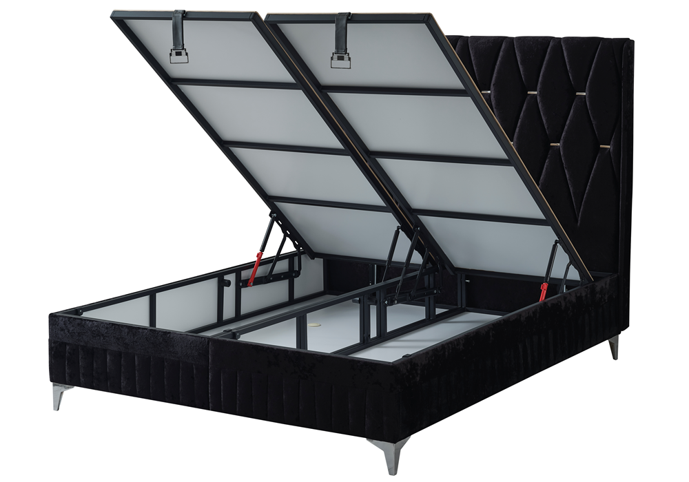 Тапицирано легло Black е НОВ модел тип боксспринг луксозно спално легло, готов вариант в комбинация с капитонирана табла и основа с повдигаща подматрачна рамка. Тапицирано спално легло Black е функционално и комфортно, притежава подматрачното пространство, където може да съхранявате спално бельо и други вещи. Таблата и основата на легло Black са тапицирани с качествена дамаска в модерен дизайн. Спално легло Black се предлага 10 стандартни размера, подходящи за двулицеви матраци.