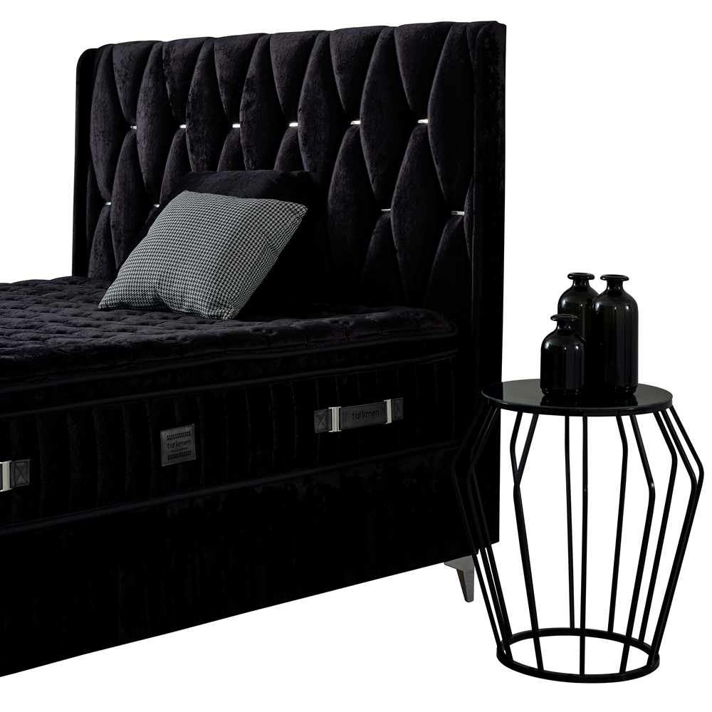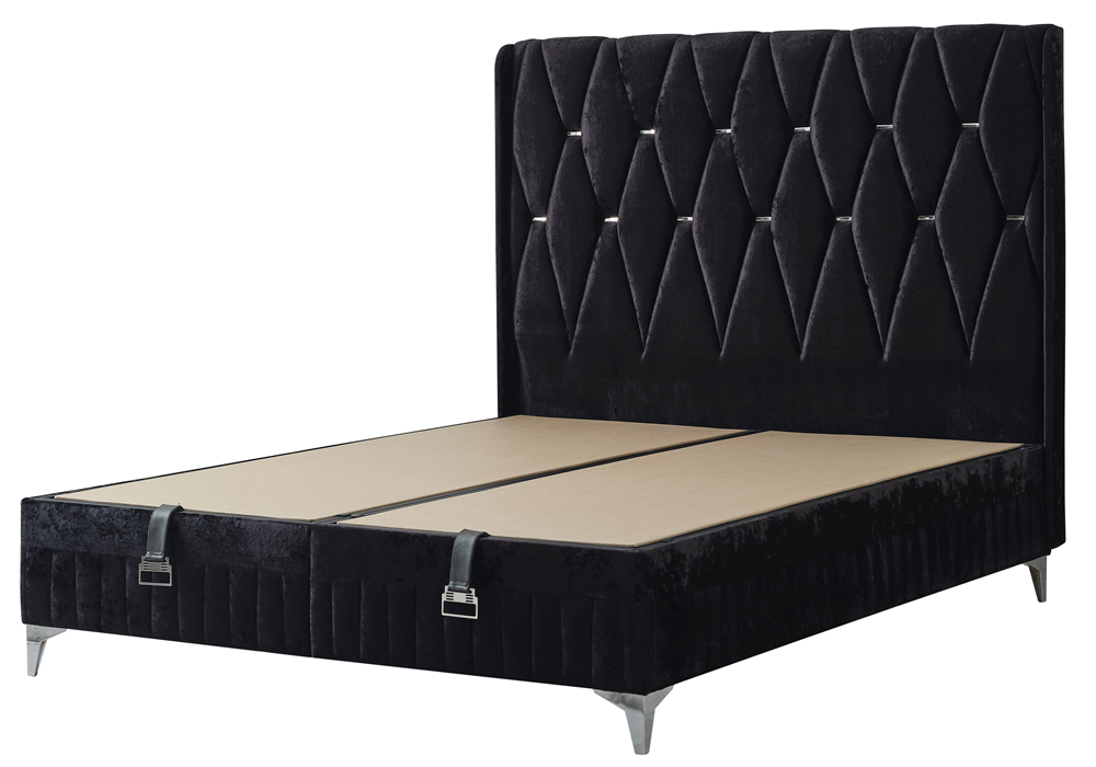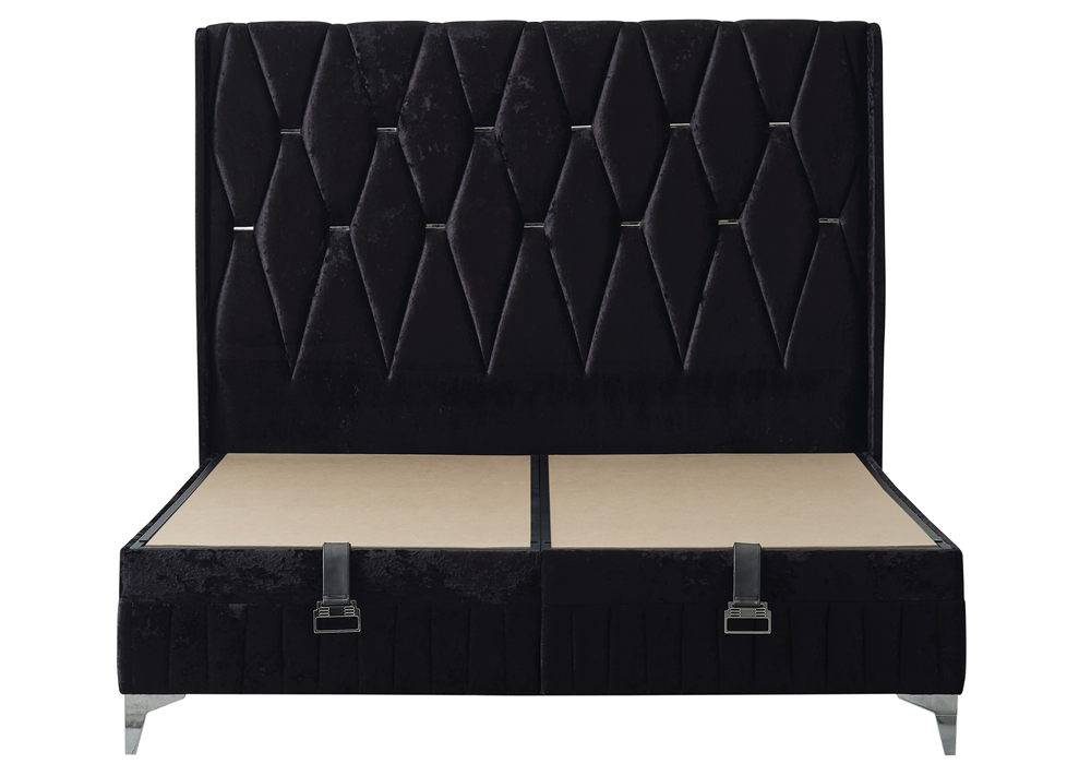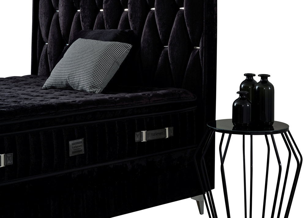 Тапицирано легло Black е НОВ модел тип боксспринг луксозно спално легло, готов вариант в комбинация с капитонирана табла и основа с повдигаща подматрачна рамка. Тапицирано спално легло Black е функционално и комфортно, притежава подматрачното пространство, където може да съхранявате спално бельо и други вещи. Таблата и основата на легло Black са тапицирани с качествена дамаска в модерен дизайн. Спално легло Black се предлага 10 стандартни размера, подходящи за двулицеви матраци.