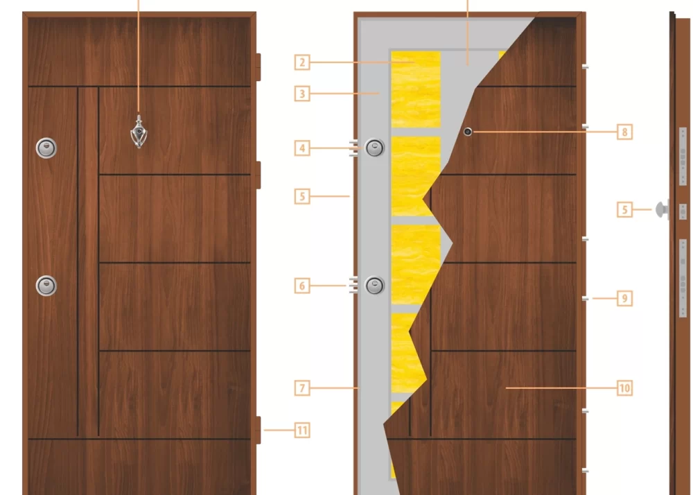 Моделите входни врати от серия Панел са снабдени с шест пасивни шипа, които влизат в касата при затворено състояние на вратата.