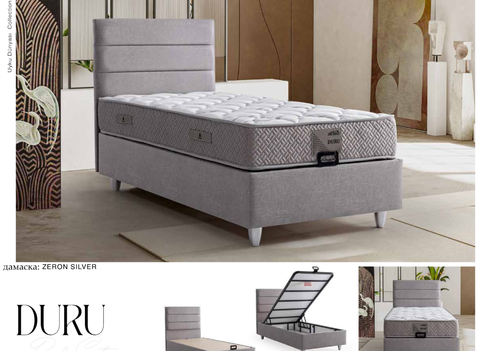 Единичното тапицирано легло Duru в елегантен сребристо‑сив цвят, тапицирано е с качествена дамаска ZERON SILVER, която осигурява уют и стилен вид. Легло Duru е оборудвано с капитонирана табла и основа с вградена повдигаща се подматрачна рамка с газови амортисьори, предоставяща просторно място за съхранение на завивки, спално бельо и други вещи.