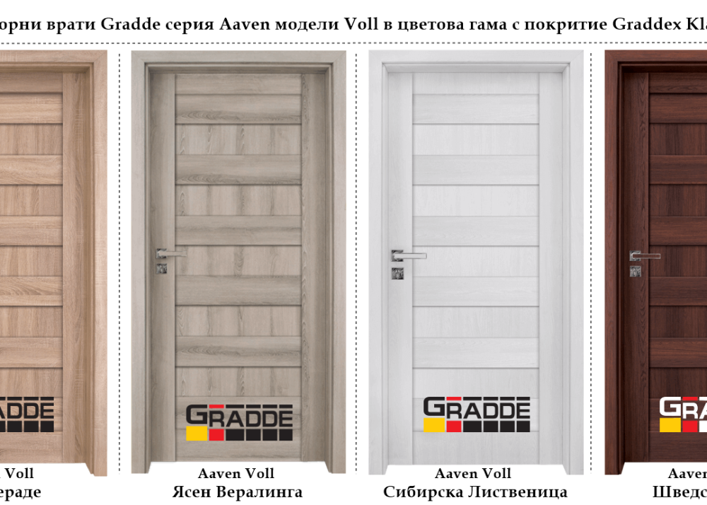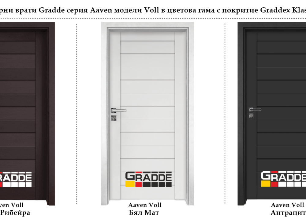Интериорни врати Gradde серия Aaven включва два уникални модела в отличаващ се дизайн и цветова гама, модел Aaven Glas (с остъклено монолитно крило) и модел Aaven Voll (с плътно монолитно крило).