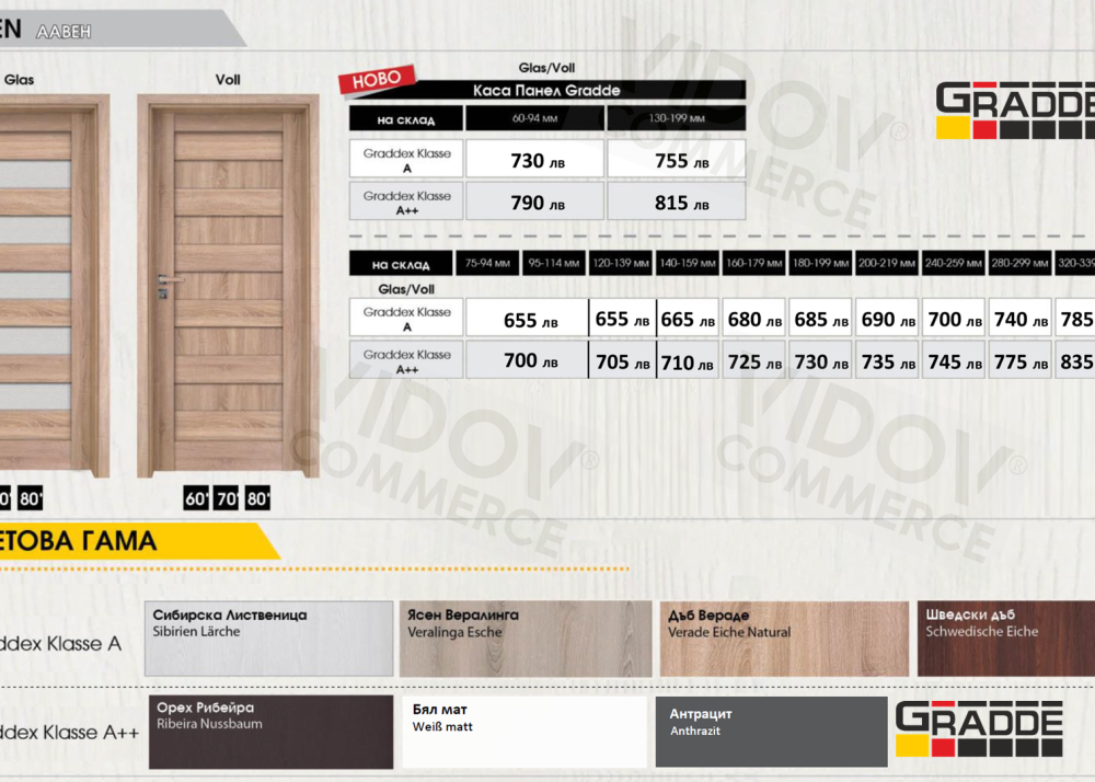 Магазин за врати VIDOV COMMERCE, предлагаме най-големите отстъпки при поръчка на голям брой врати Gradde. За строителни фирми, хотели, кооперации, за юридически лица или физическо лице, ще изготвим най-изгодната оферта.