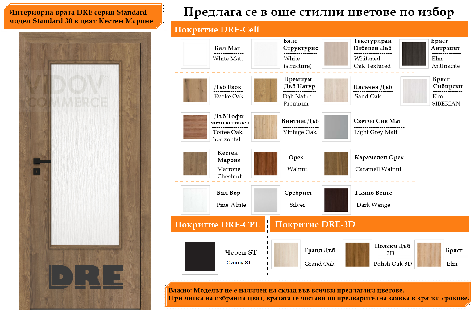 Всички модели интериорнати врати от серия Standard се предлагат в богата цветова гама с устойчиви покрития DRE-CELL, DRE-CPL и DRE-3D фолиа, които се отличават с висока издръжливост на надраскване, запазване на цвета и дългогодишна устойчивост.