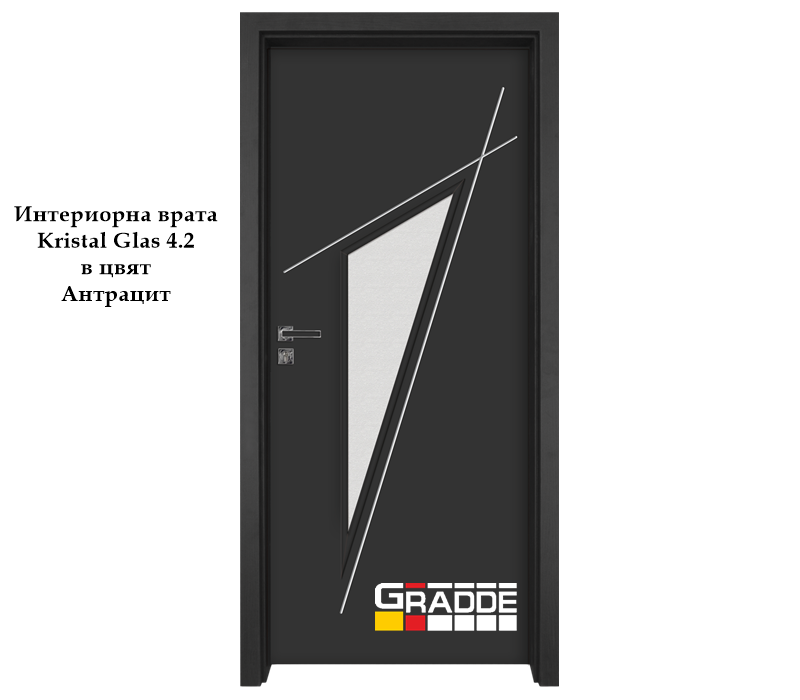 Крилото на модел Kristal Glas 4-2 е остъклено със стъкло тип БЯЛ МАТ, декорирано е и с алуминиеви лайсни Matt Finish. Изработва се по-иновативна технология Standart със заоблени ръбове, от масивен HDF материал с пълнеж тип „пчелна пита“, като се предлага и с пълнеж „перфорирано ПДЧ“. Стъклото е вградено посредством MDF стъклодържач. Крилото и касата са в покритие Graddex Klasse A++ в цвят Антрацит. Крилото се изработва в 2 размера – 70/197.5см, 80/197.5см (по-избор). По-поръчка може да се изработи и в размер 60/197.5см.