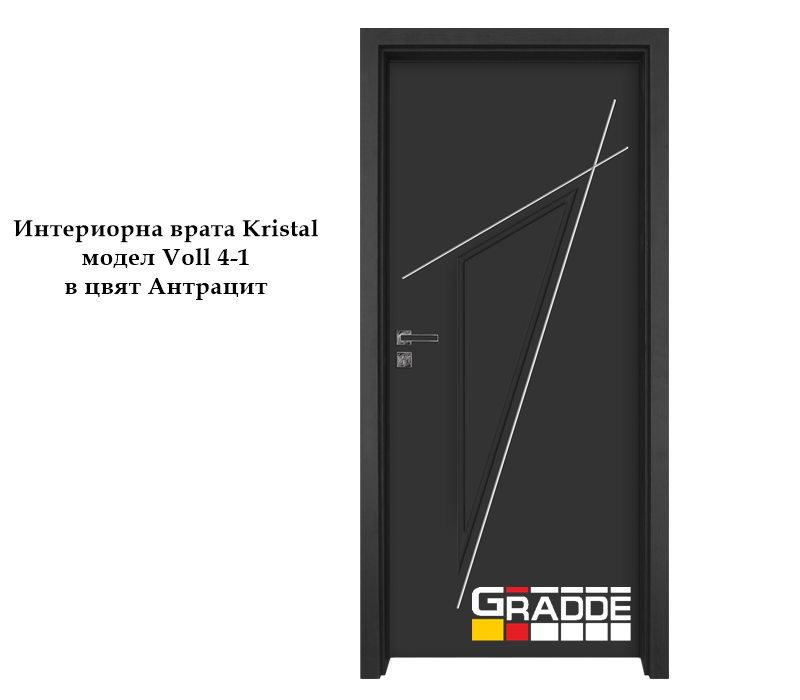 Крилото на модел Kristal Voll 4-1 е плътно, декорирано е с MDF лайсни и алуминиеви лайсни Matt Finish, придаващи красив ефект. Изработва се по-иновативна технология Standart със заоблени ръбове, от масивен HDF материал с пълнеж тип „пчелна пита“, като се предлага и с пълнеж „перфорирано ПДЧ“. Крилото и касата са в покритие Graddex Klasse A++ в цвят Антрацит. Крилото се изработва в 3 размера – 60/197.5см, 70/197.5см, 80/197.5см (по-избор).