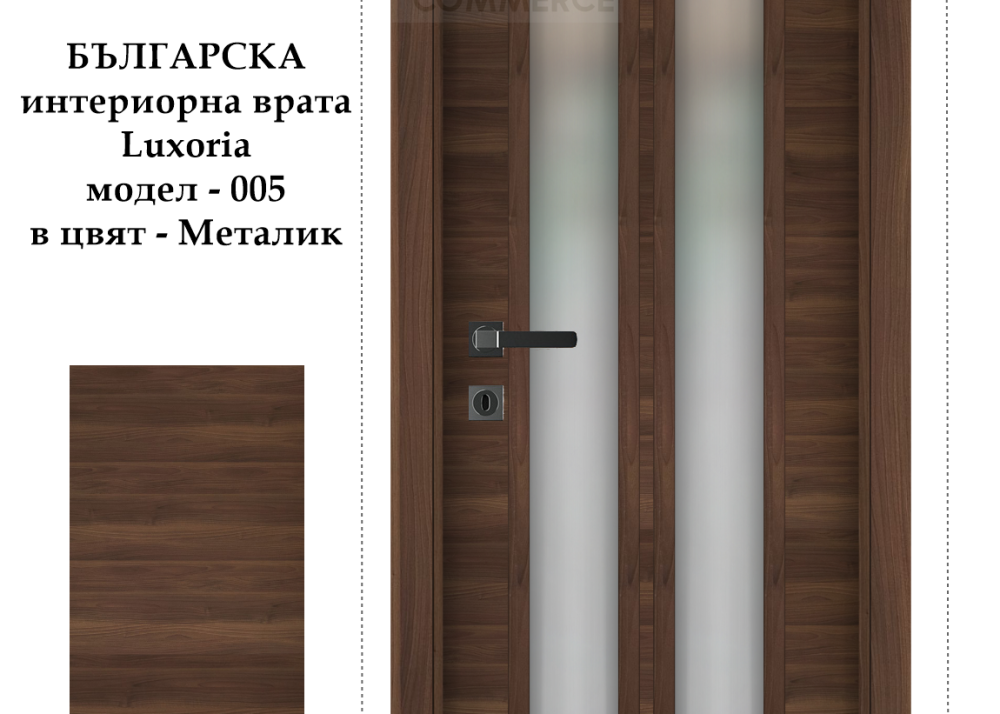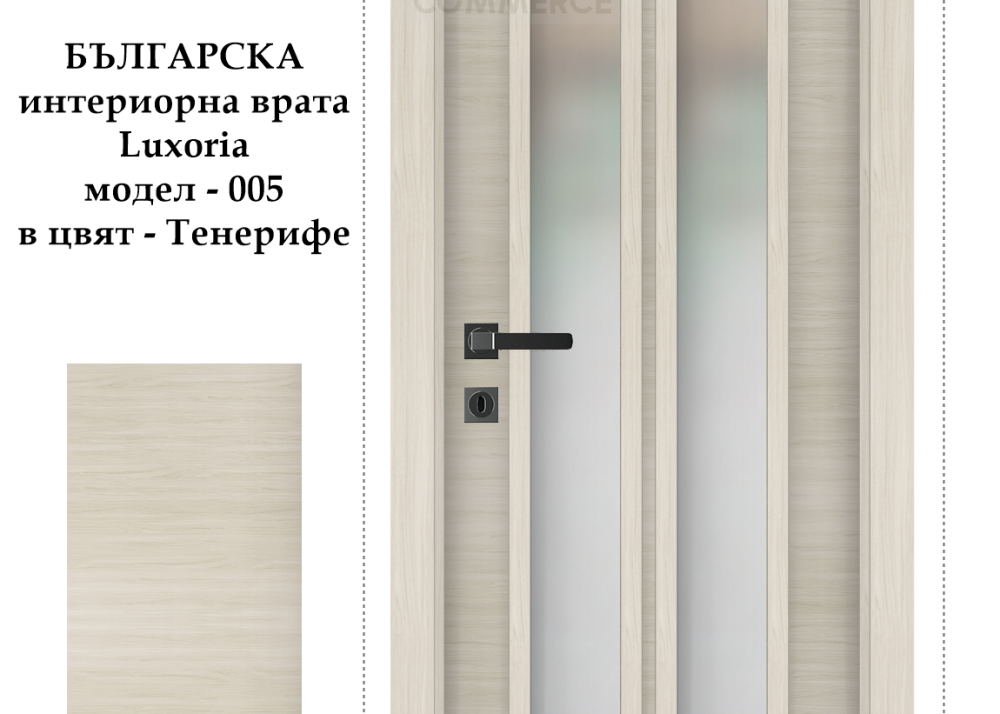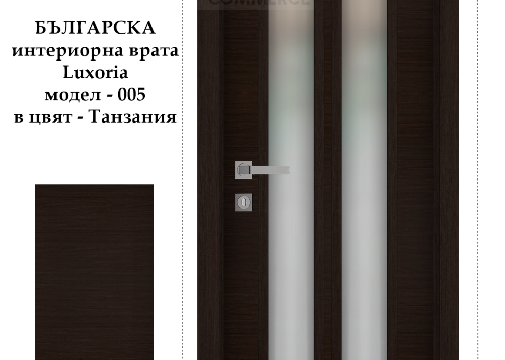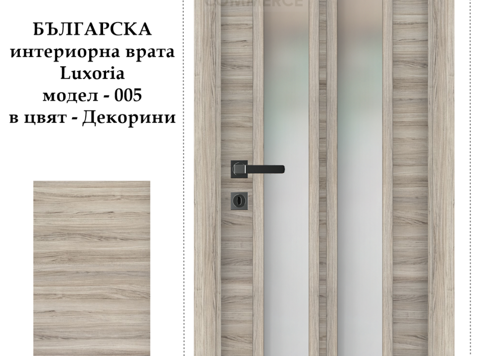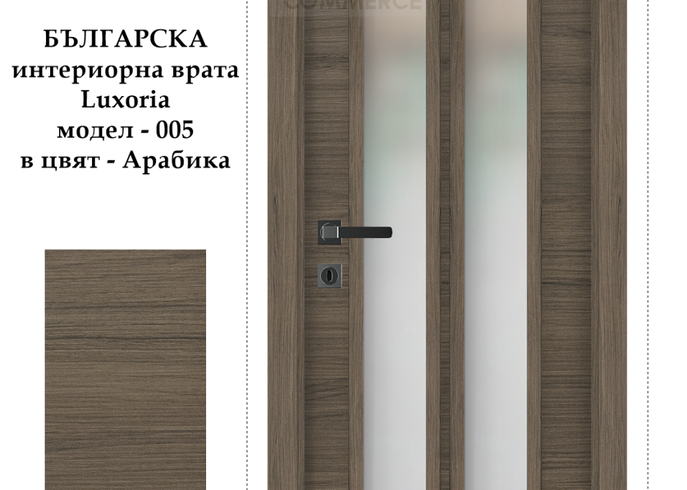 Българска интериорна врата Luxoria, модел 005 е с модерно остъклено крило в комплект с регулируема каса. Изработва се по индивидуални размери, по избор в 12 цвята.