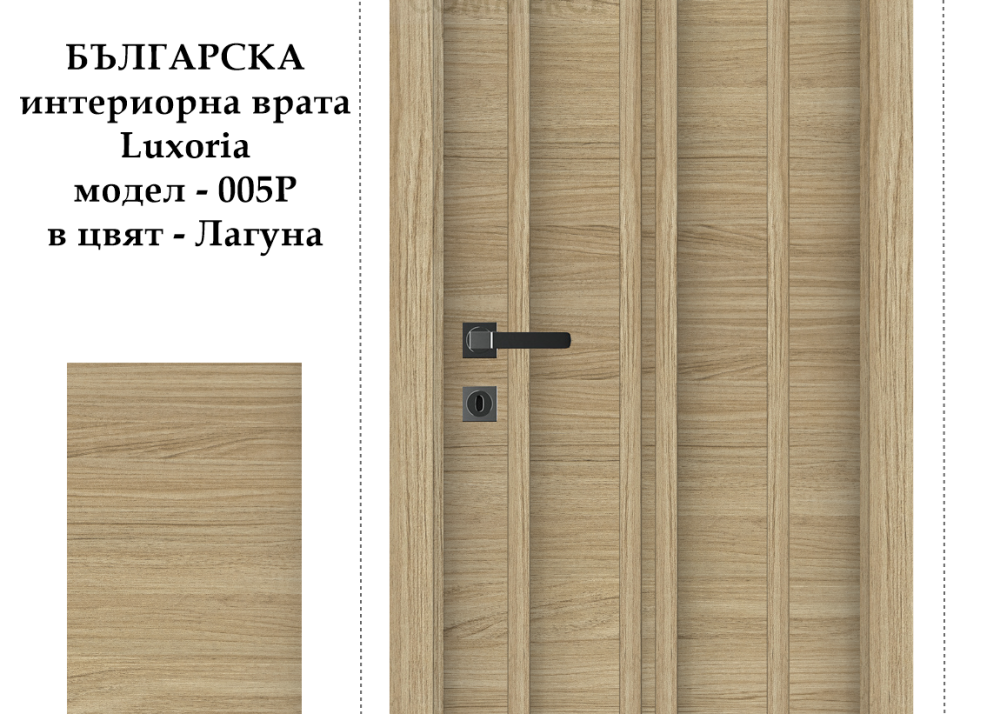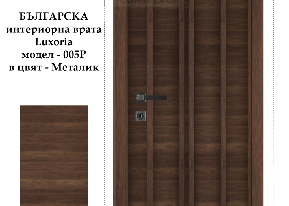 Качествена Българска интериорна врата Luxoria, модел 005P, с декорирано модерно крило, в комплект с регулируема каса и прави первази. Крилото на интериорна врата Luxoria 005P е декорирано с MDF държачи и MDF плоскости, предлага се в 12 цвята, с устойчиво покритие от 3D ефект Lux фолио, което имитира триизмерен ефект на естествен фурнир. Интериорна врата Luxoria, модел 005P е поръчков модел, изработва се по-индивидуални размери на клиента.