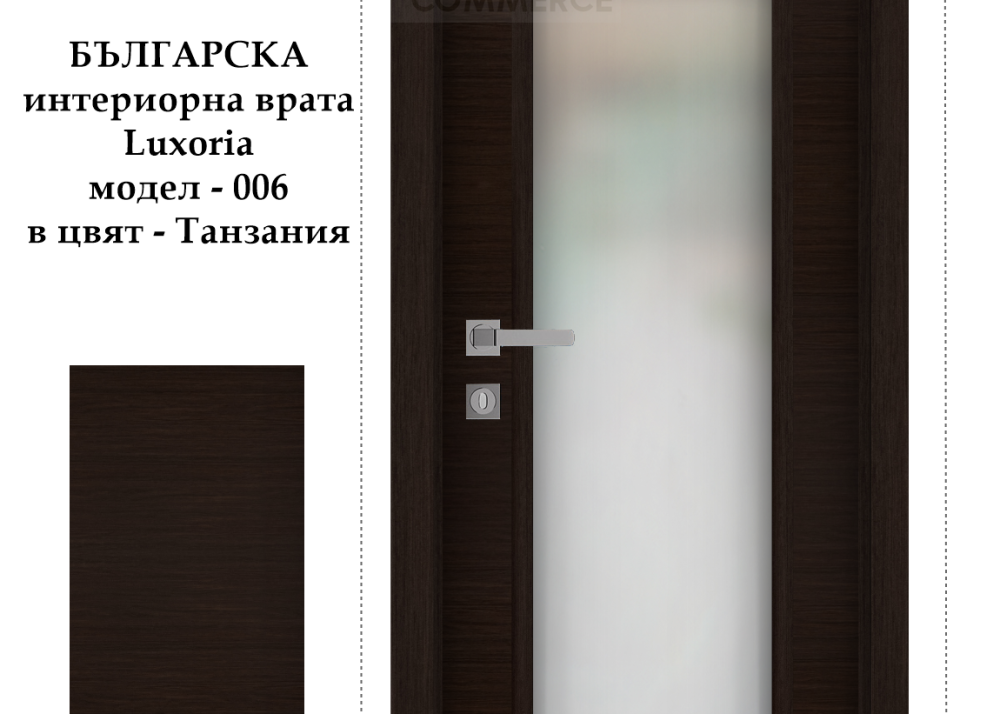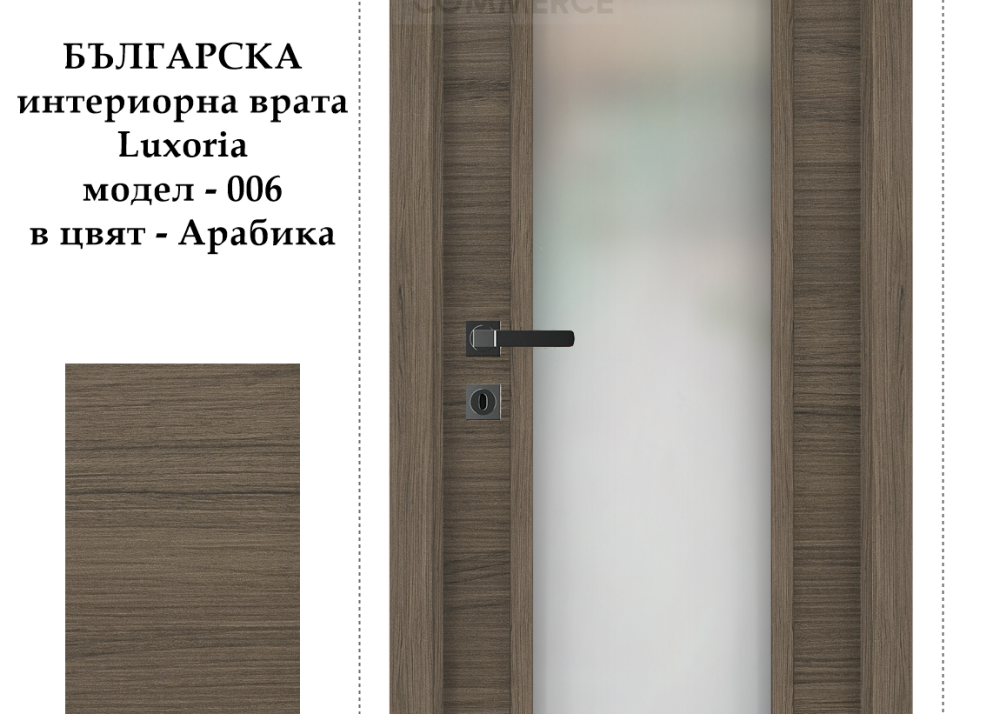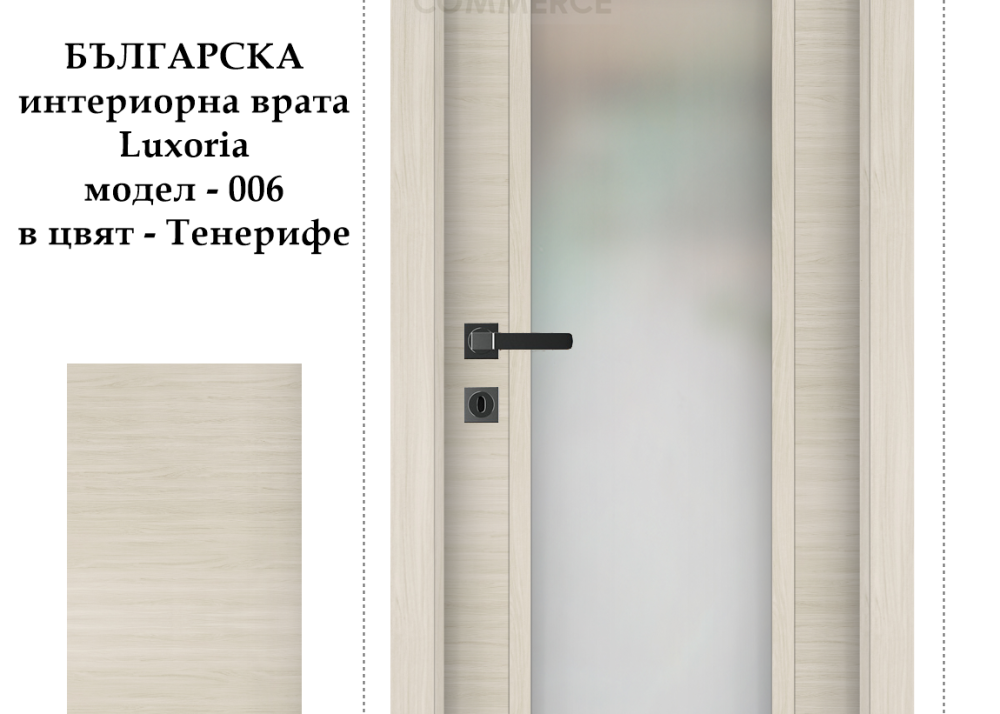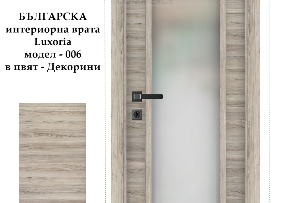 Качествена Българска интериорна врата Luxoria, модел 006, с модерно остъклено крило в комплект с регулируема каса и прави первази. Крилото на интериорна врата Luxoria 006 е остъклено със стъкло тип БЯЛ МАТ, вградено посредством MDF държач, предлага се в 12 цвята, с устойчиво покритие от 3D ефект Lux фолио, което имитира триизмерен ефект на естествен фурнир. Интериорна врата Luxoria, модел 006 е поръчков модел, изработва се по-индивидуални размери на клиента.