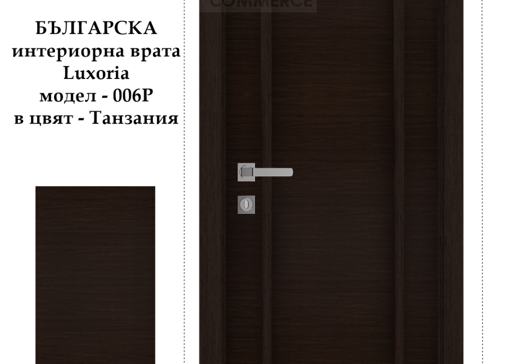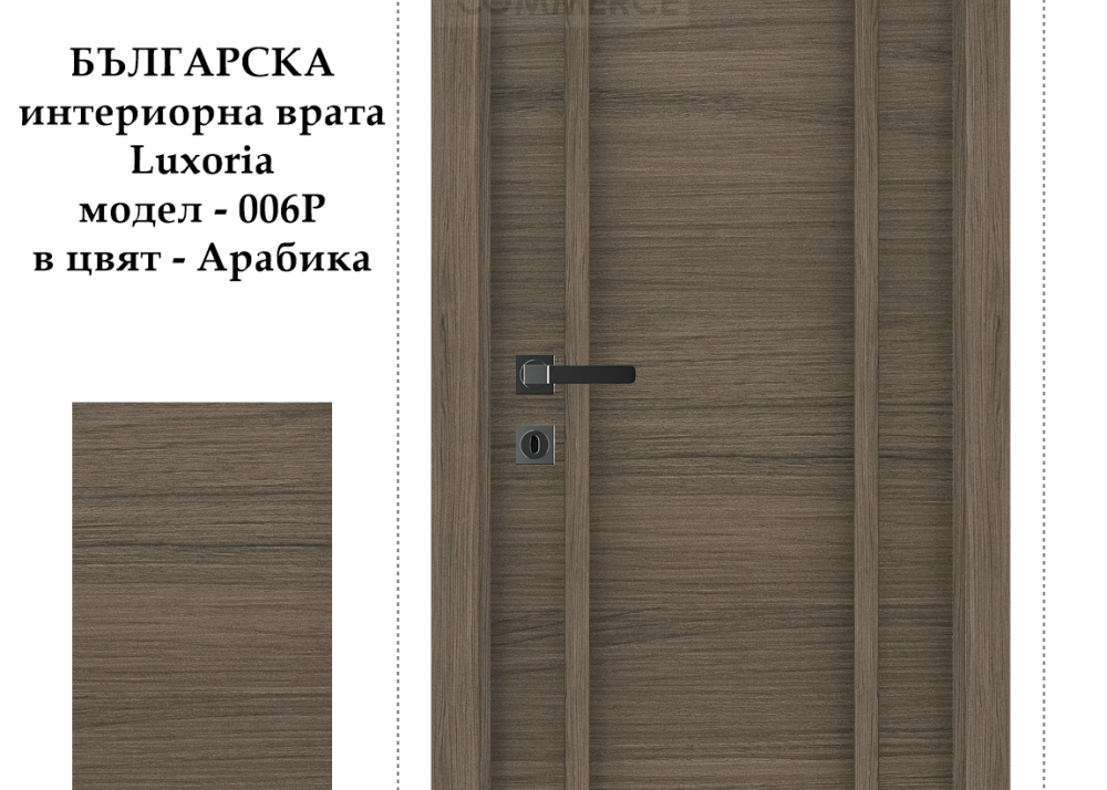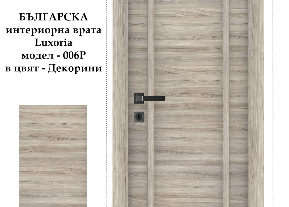 Качествена Българска интериорна врата Luxoria, модел 006P, с декорирано модерно крило, в комплект с регулируема каса и прави первази. Крилото на интериорна врата Luxoria 006P е декорирано с MDF държач и MDF плоскости, предлага се в 12 цвята, с устойчиво покритие от 3D ефект Lux фолио, което имитира триизмерен ефект на естествен фурнир. Интериорна врата Luxoria, модел 006P е поръчков модел, изработва се по-индивидуални размери на клиента.