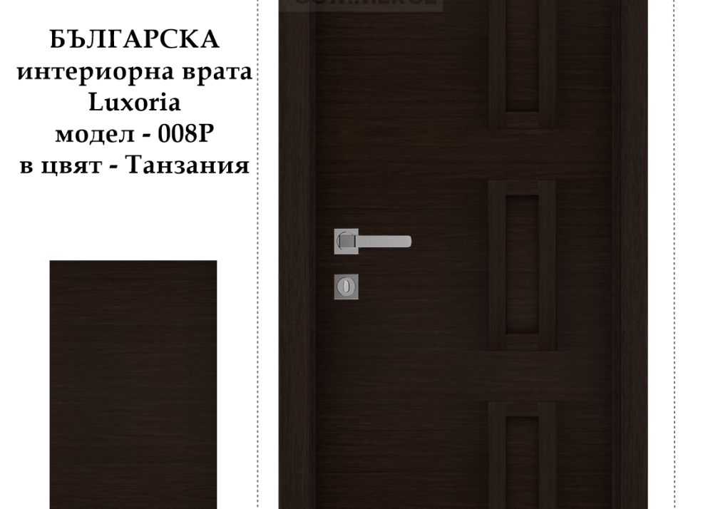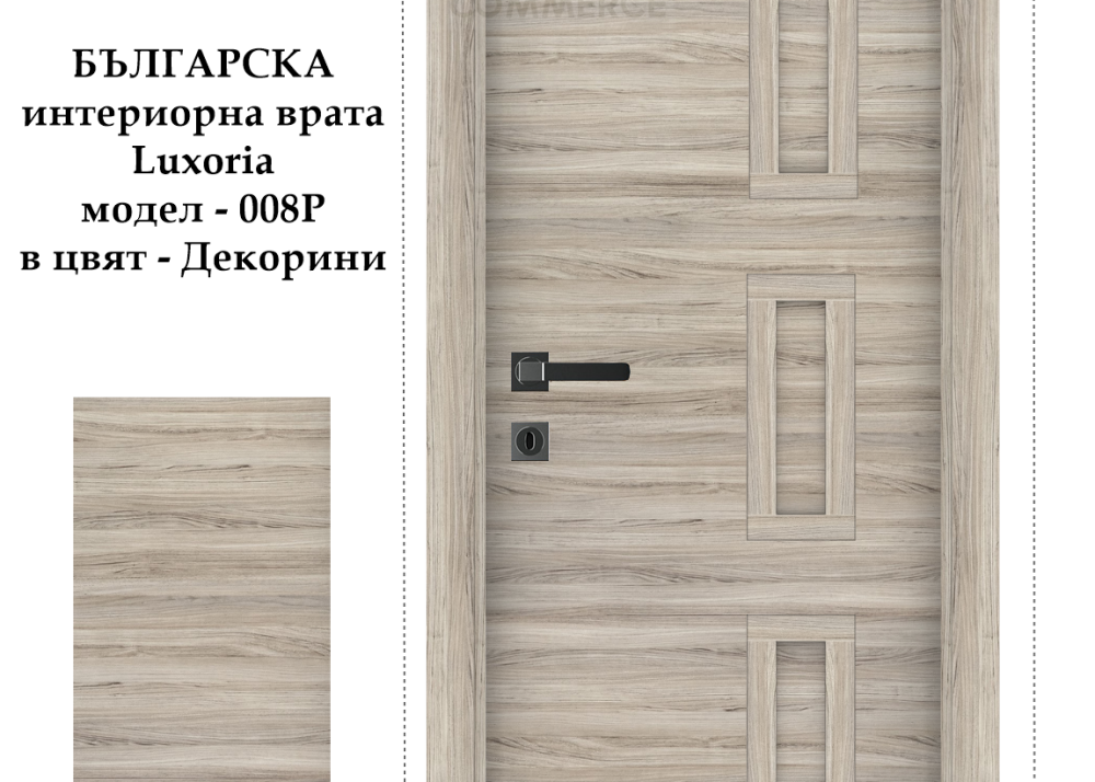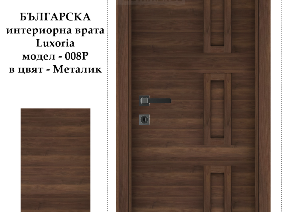 Българска интериорна врата Luxoria, модел 008P в комплект с регулируема каса. Изработва се по индивидуални размери, по избор в 12 цвята.