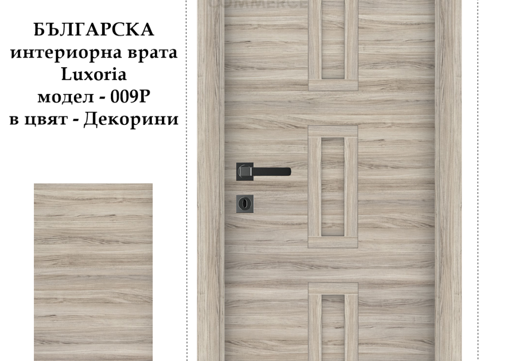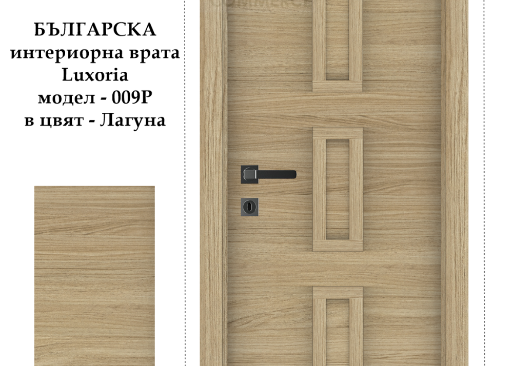 Качествена Българска интериорна врата Luxoria, модел 009P, с декорирано модерно крило, в комплект с регулируема каса и прави первази. Крилото на интериорна врата Luxoria 009P е декорирано с MDF държачи и MDF плоскости, предлага се в 12 цвята, с устойчиво покритие от 3D ефект Lux фолио, което имитира триизмерен ефект на естествен фурнир. Интериорна врата Luxoria, модел 009P е поръчков модел, изработва се по-индивидуални размери на клиента.