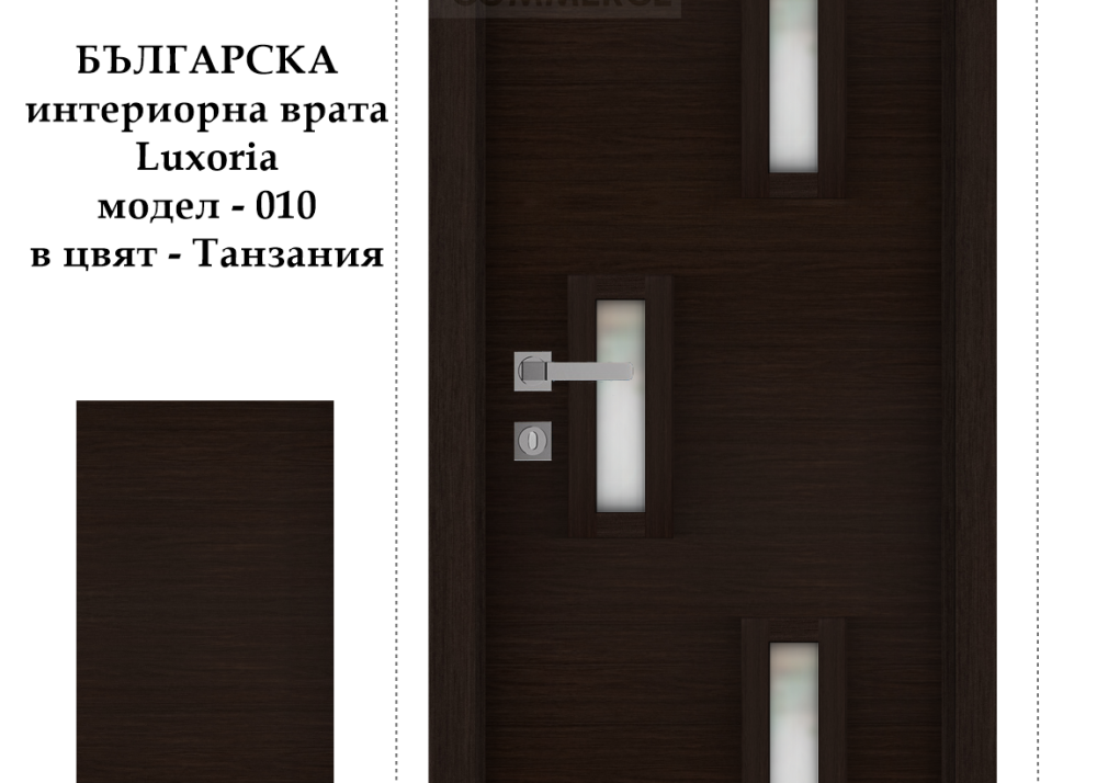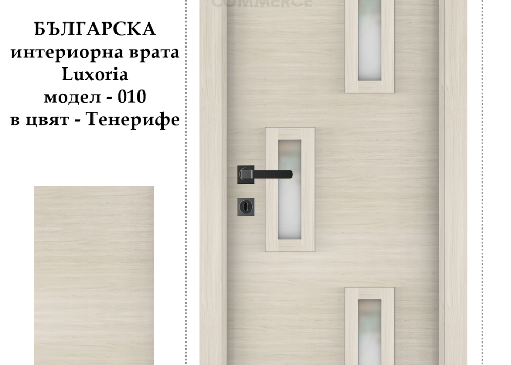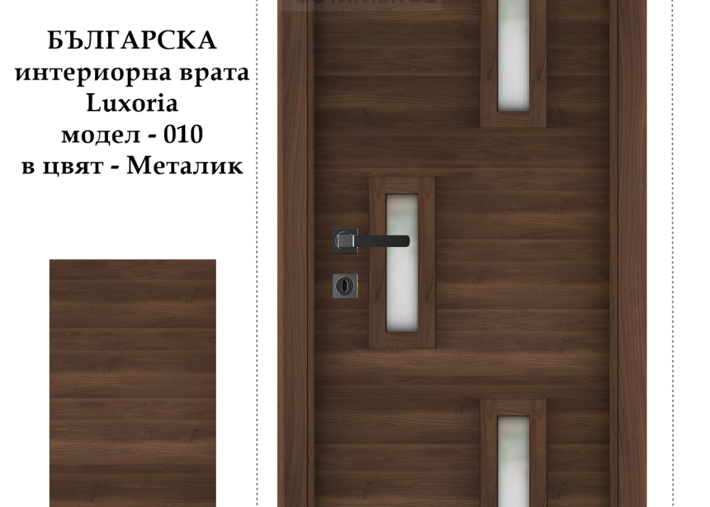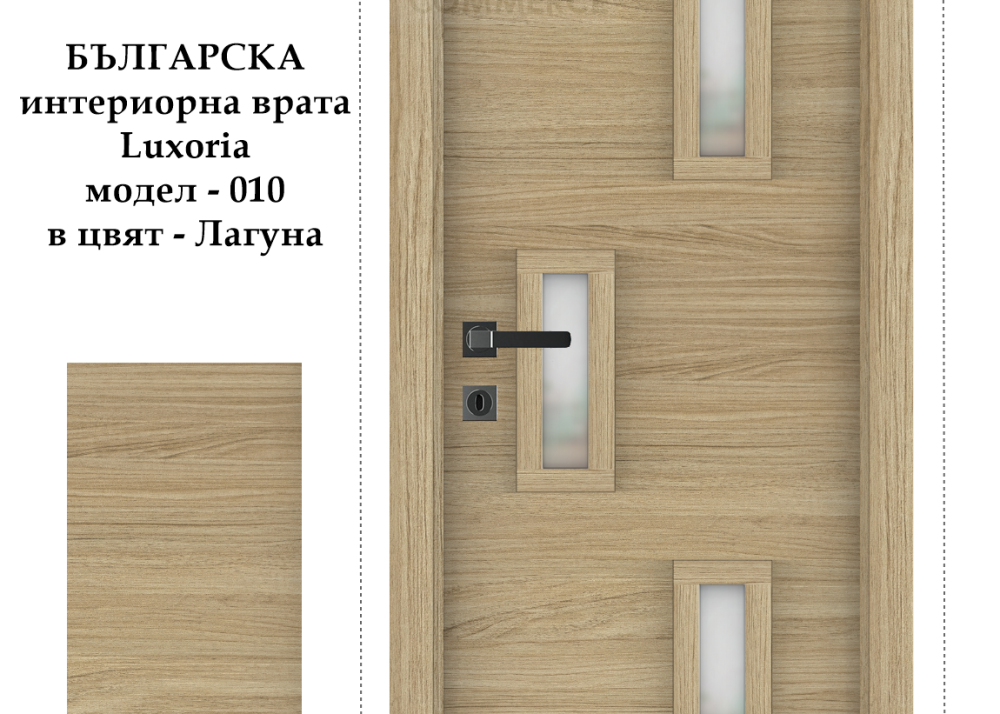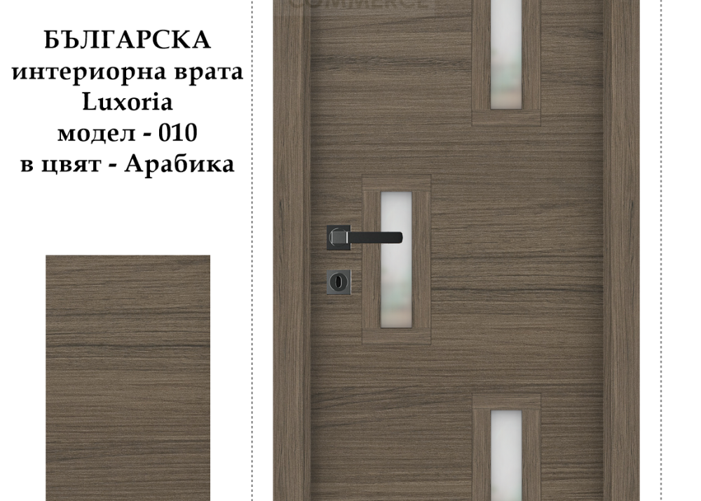 Качествена Българска интериорна врата Luxoria, модел 010, с модерно остъклено крило в комплект с регулируема каса и прави первази. Крилото на интериорна врата Luxoria 010 е остъклено със стъкла тип БЯЛ МАТ, вградени са посредством MDF държачи, предлага се в 12 цвята, с устойчиво покритие от 3D ефект Lux фолио, което имитира триизмерен ефект на естествен фурнир. Интериорна врата Luxoria, модел 010 е поръчков модел, изработва се по-индивидуални размери на клиента.