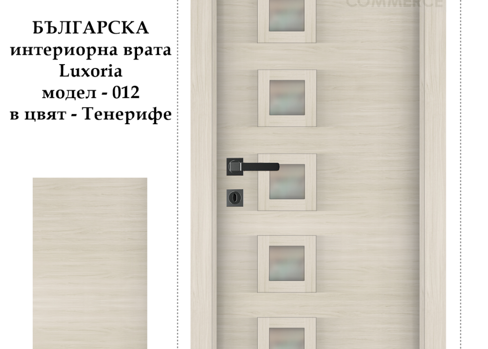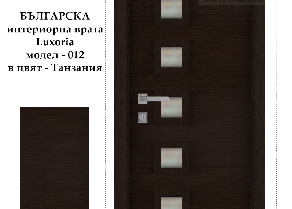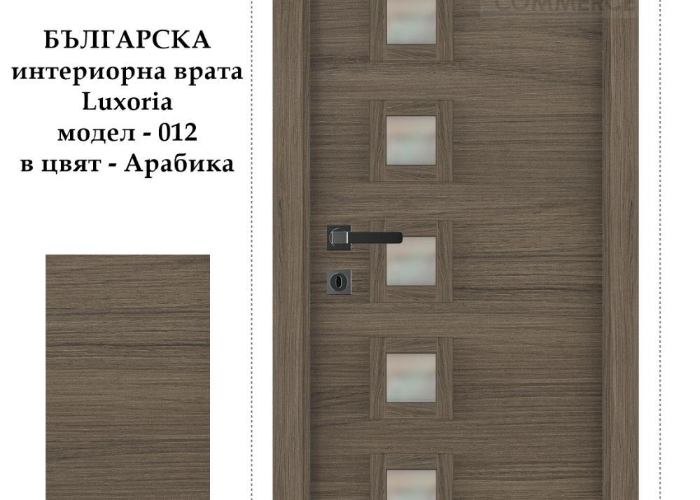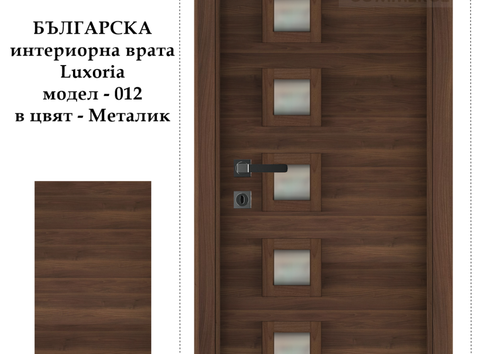 Качествена Българска интериорна врата Luxoria, модел 012, с модерно остъклено крило в комплект с регулируема каса и прави первази. Крилото на интериорна врата Luxoria 012 е остъклено със стъкла тип БЯЛ МАТ, вградени са посредством MDF държачи, предлага се в 12 цвята, с устойчиво покритие от 3D ефект Lux фолио, което имитира триизмерен ефект на естествен фурнир. Интериорна врата Luxoria, модел 012 е поръчков модел, изработва се по-индивидуални размери на клиента.