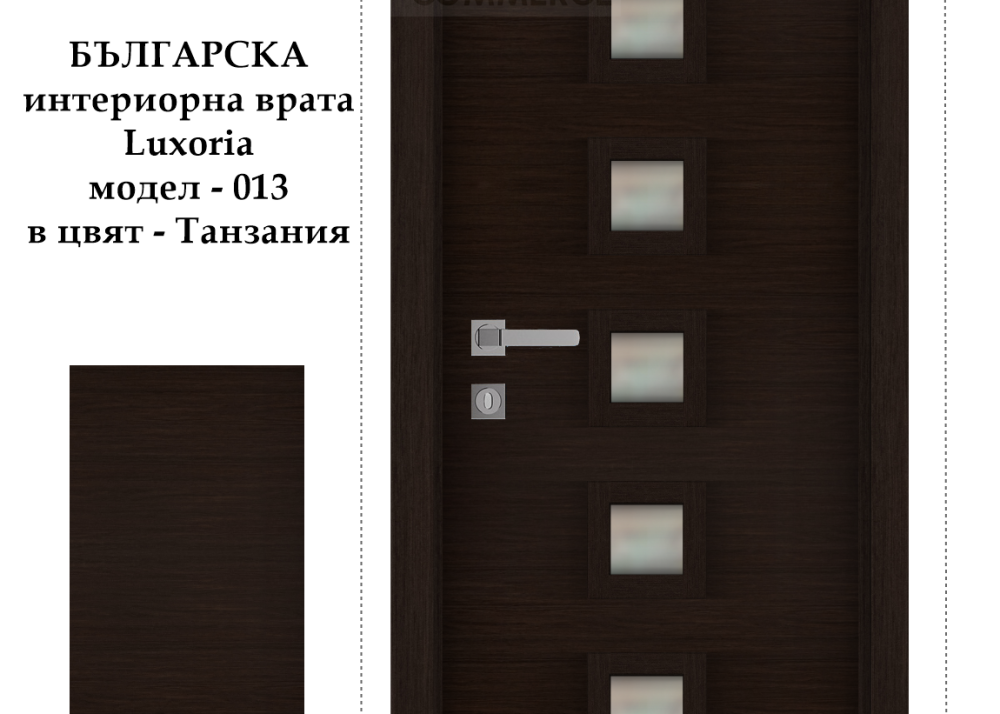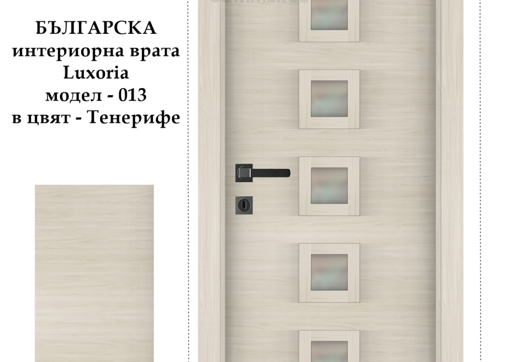 Качествена Българска интериорна врата Luxoria, модел 013, с модерно остъклено крило в комплект с регулируема каса и прави первази. Крилото на интериорна врата Luxoria 013 е остъклено със стъкла тип БЯЛ МАТ, вградени са посредством MDF държачи, предлага се в 12 цвята, с устойчиво покритие от 3D ефект Lux фолио, което имитира триизмерен ефект на естествен фурнир. Интериорна врата Luxoria, модел 013 е поръчков модел, изработва се по-индивидуални размери на клиента.