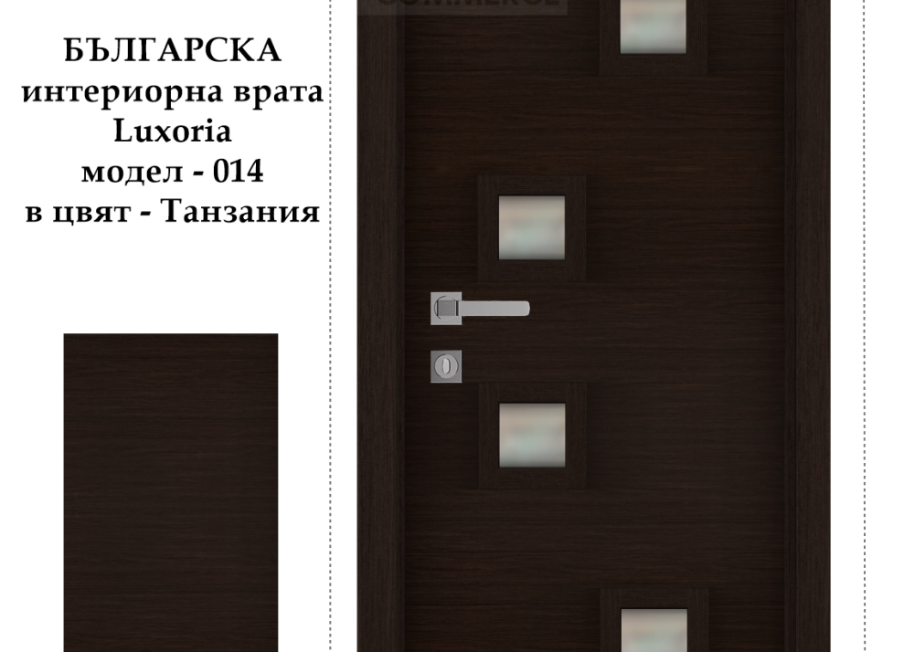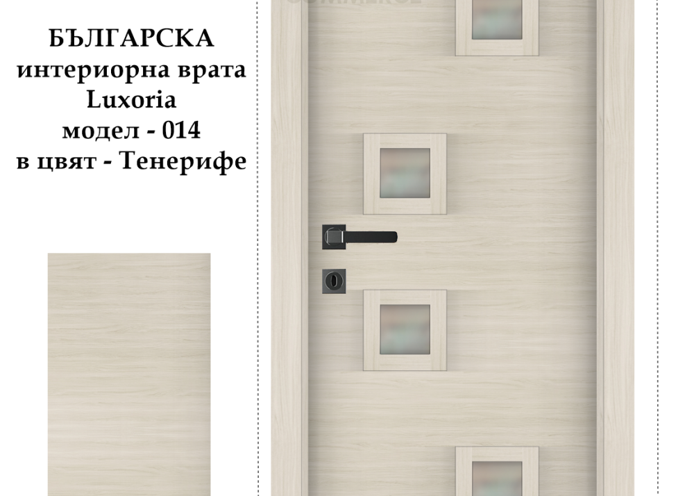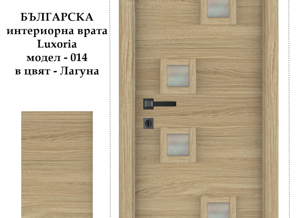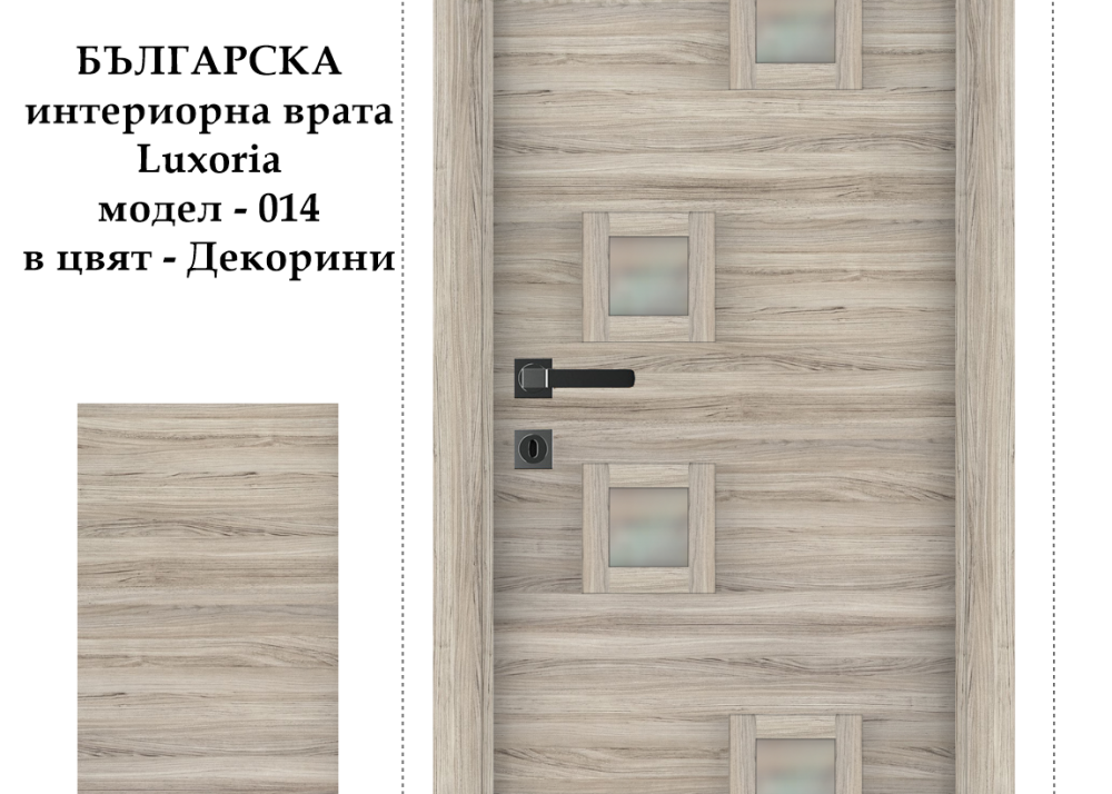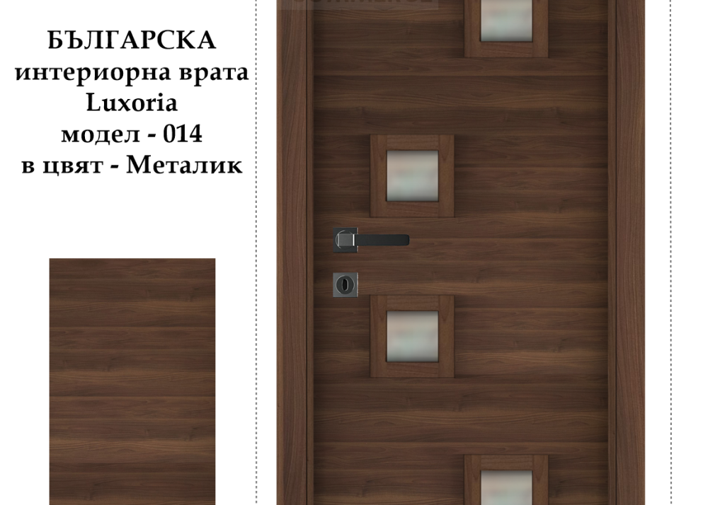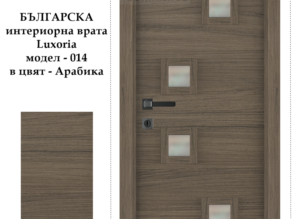 Качествена Българска интериорна врата Luxoria, модел 014, с модерно остъклено крило в комплект с регулируема каса и прави первази. Крилото на интериорна врата Luxoria 014 е остъклено със стъкла тип БЯЛ МАТ, вградени са посредством MDF държачи, предлага се в 12 цвята, с устойчиво покритие от 3D ефект Lux фолио, което имитира триизмерен ефект на естествен фурнир. Интериорна врата Luxoria, модел 014 е поръчков модел, изработва се по-индивидуални размери на клиента.