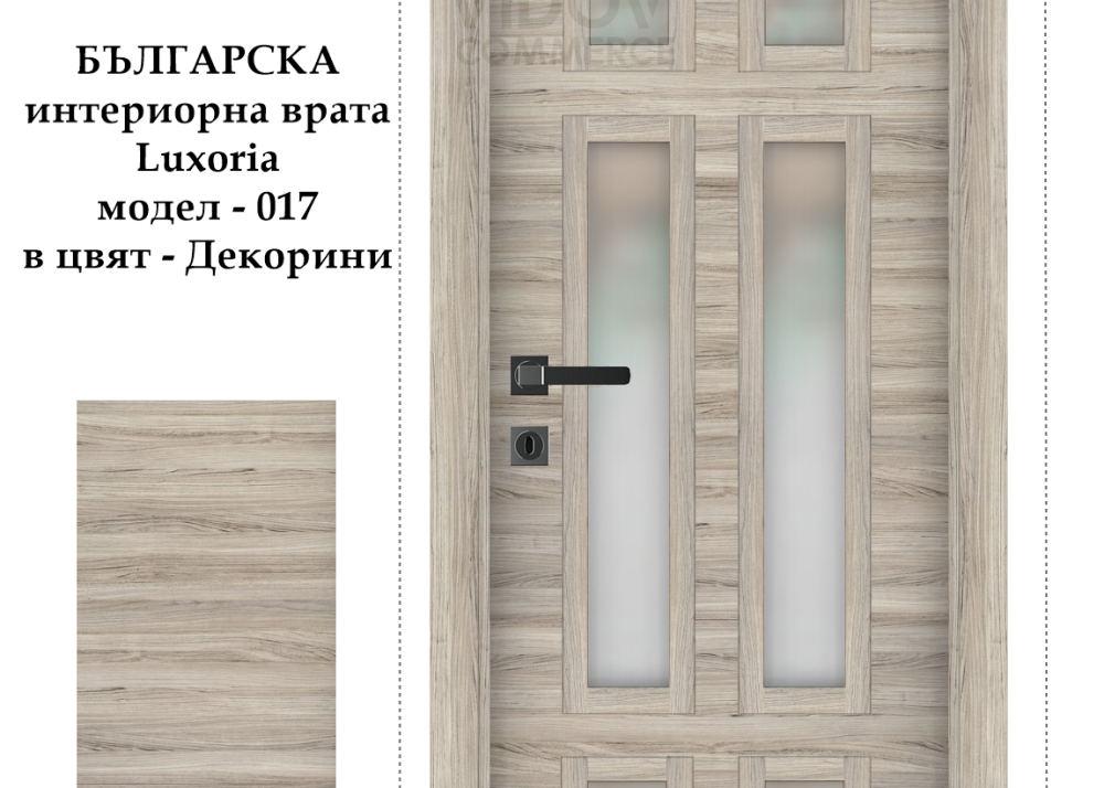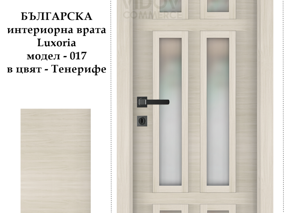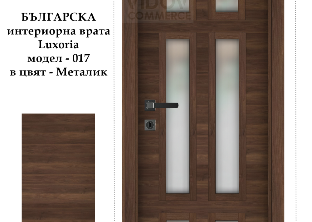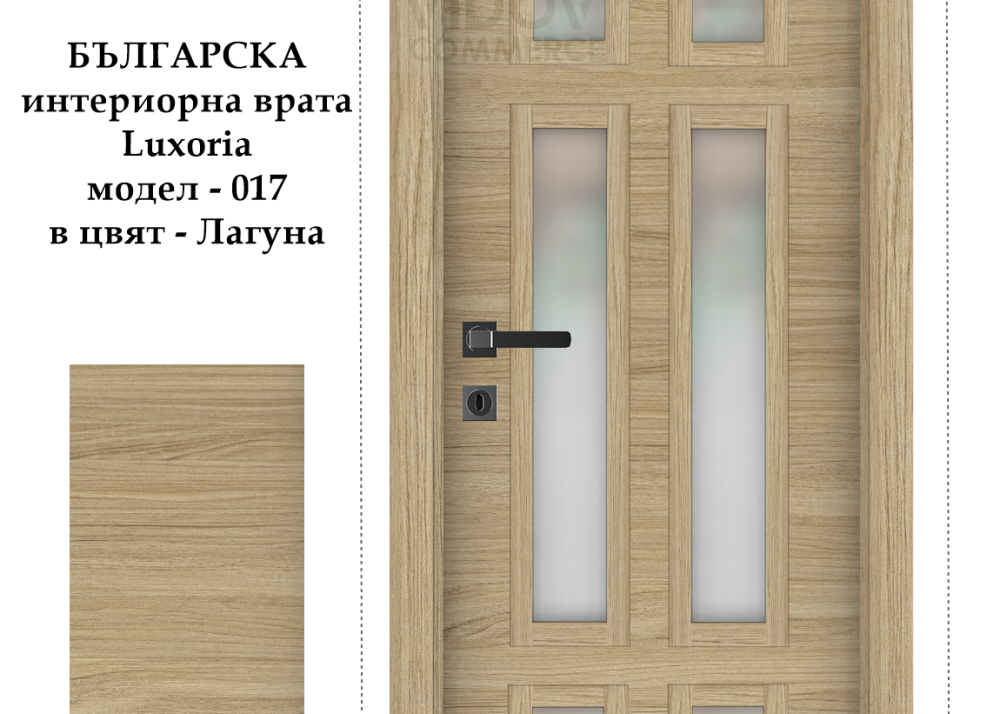 Качествена Българска интериорна врата Luxoria, модел 017, с модерно остъклено крило в комплект с регулируема каса и прави первази. Крилото на интериорна врата Luxoria 017 е остъклено със стъкла тип БЯЛ МАТ, вградени са посредством MDF държачи, предлага се в 12 цвята, с устойчиво покритие от 3D ефект Lux фолио, което имитира триизмерен ефект на естествен фурнир. Интериорна врата Luxoria, модел 017 е поръчков модел, изработва се по-индивидуални размери на клиента.