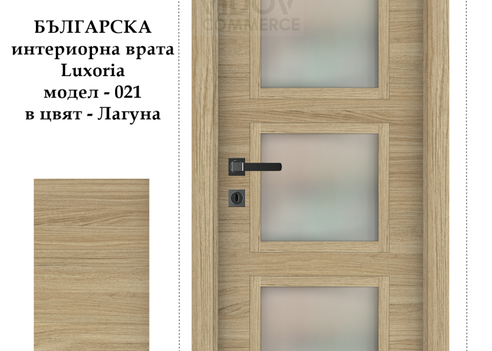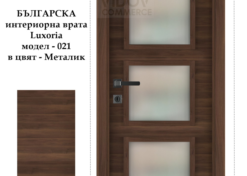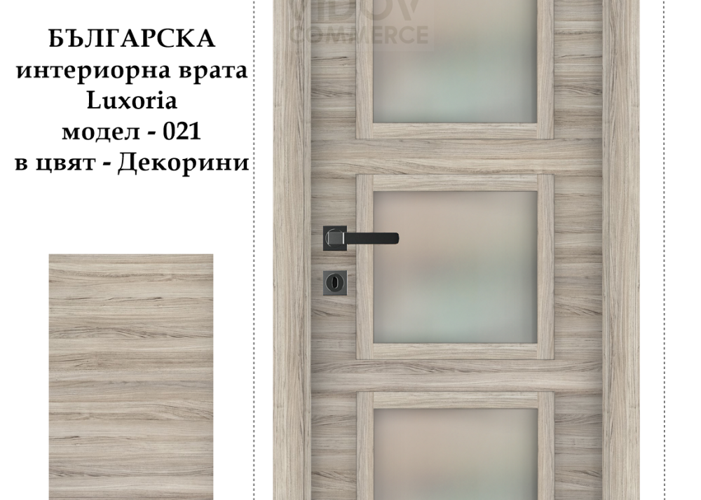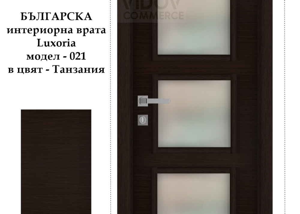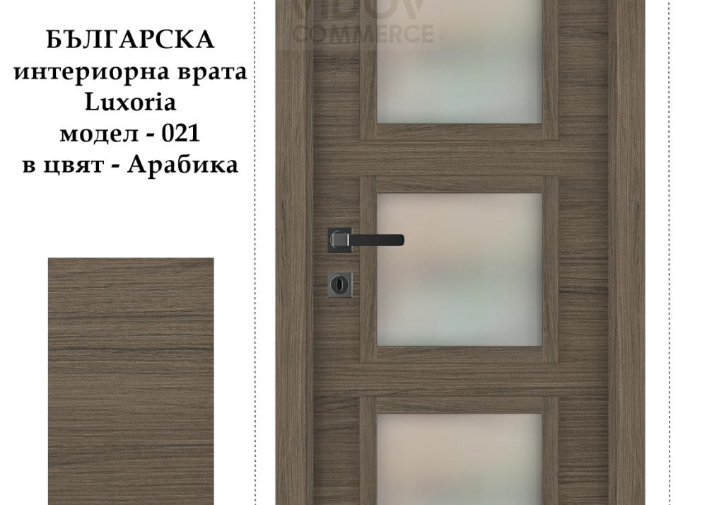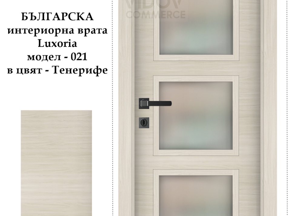 Качествена Българска интериорна врата Luxoria, модел 021, с модерно остъклено крило в комплект с регулируема каса и прави первази. Крилото на интериорна врата Luxoria 021 е остъклено със стъкла тип БЯЛ МАТ, вградени са посредством MDF държачи, предлага се в 12 цвята, с устойчиво покритие от 3D ефект Lux фолио, което имитира триизмерен ефект на естествен фурнир. Интериорна врата Luxoria, модел 021 е поръчков модел, изработва се по-индивидуални размери на клиента.