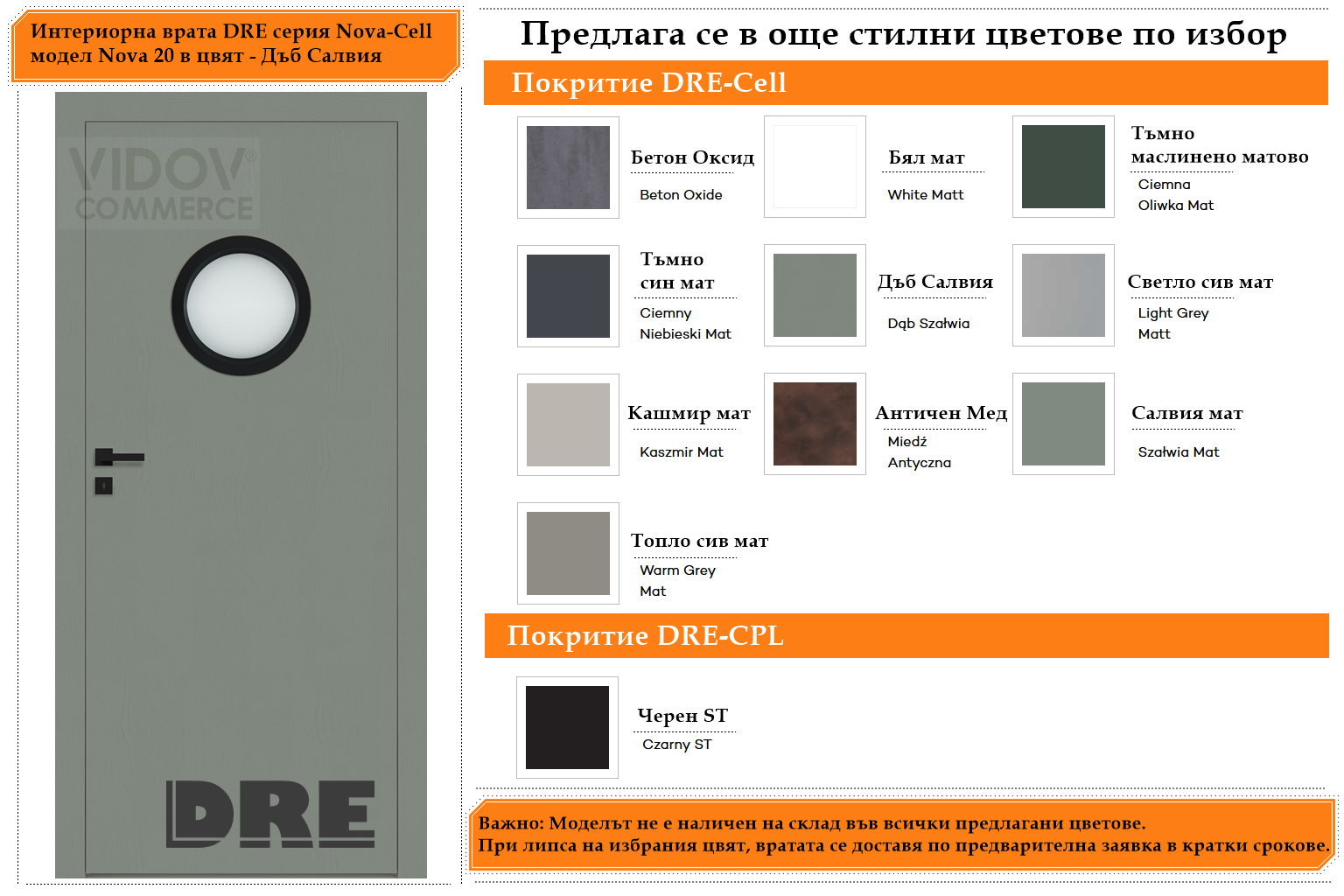 Всички модели интериорнати врати от серия Nova – Cell се предлагат в богата цветова гама с устойчиви покрития DRE-CELL и DRE-CPL, които се отличават с висока издръжливост на надраскване, запазване на цвета и дългогодишна устойчивост.