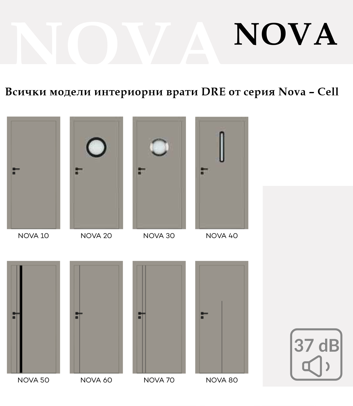 Серията Nova – Cell предлага богато разнообразие от модели – от плътни, изчистени крила, през модели с декоративни ламинатни лайсни, които са инкрустирани в повърхността (тип интарзии), до остъклени варианти с ефектна bezel система, наподобяваща кръгли и линейни илюминатори. Всеки модел е проектиран с внимание към дизайна, функционалността и визуалния баланс, което прави вратите подходящи за всякакъв тип вътрешни помещения – както в жилищни, така и в офис пространства.