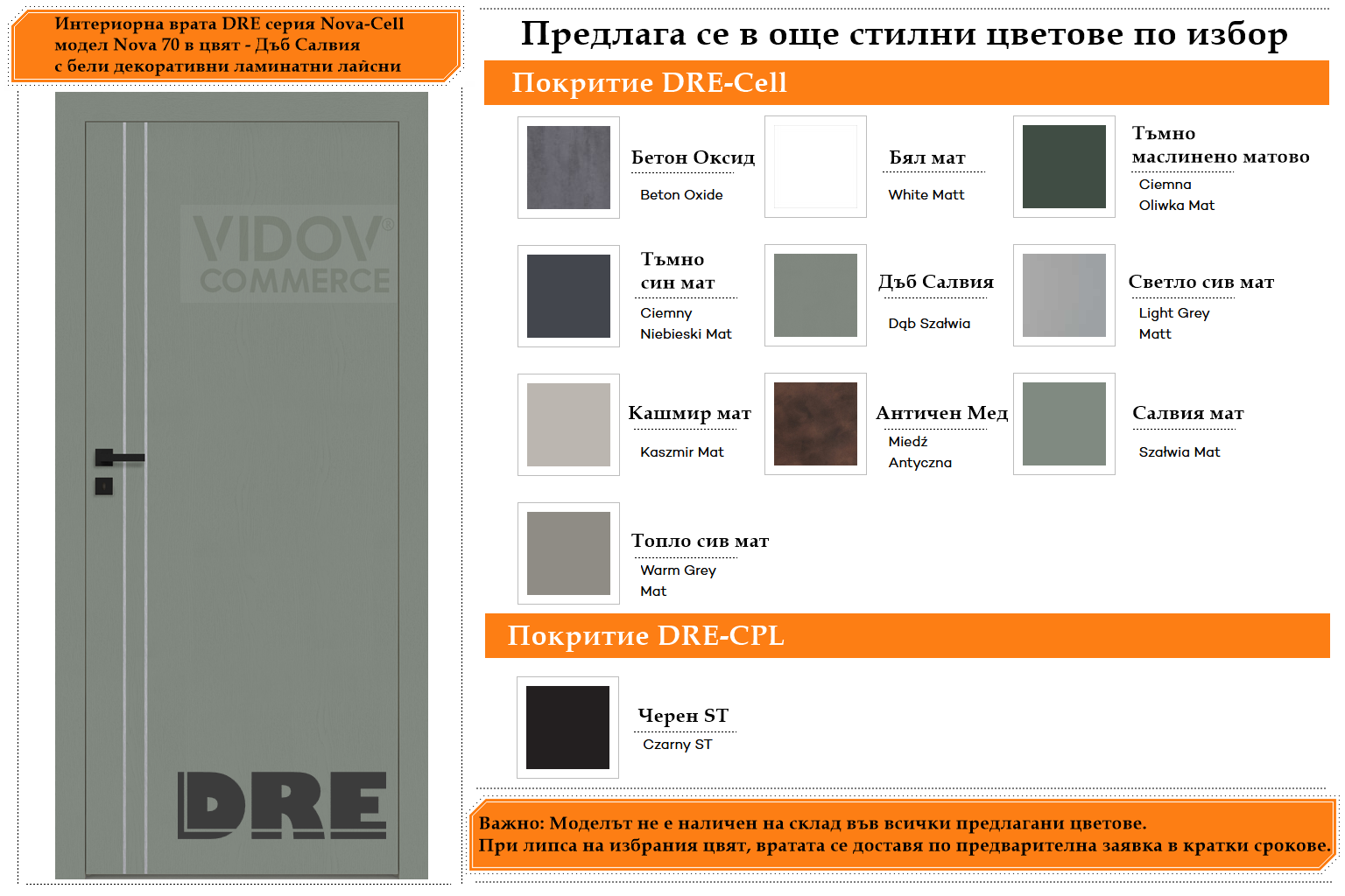 Всички модели интериорнати врати от серия Nova – Cell се предлагат в богата цветова гама с устойчиви покрития DRE-CELL и DRE-CPL, които се отличават с висока издръжливост на надраскване, запазване на цвета и дългогодишна устойчивост.