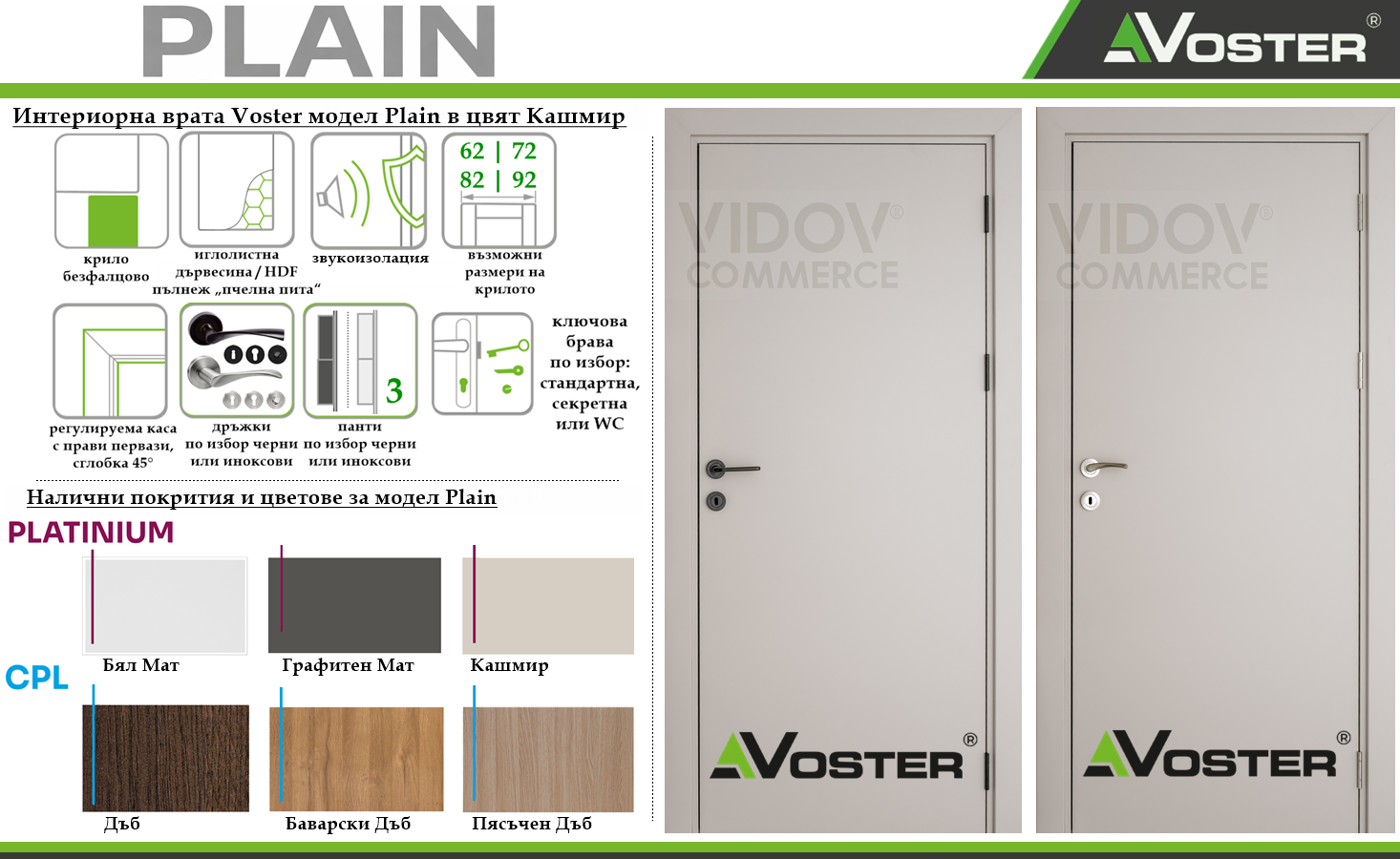 Важно е да се уточни, че крайната цена се определя от избора на покритие и цвят. Вратите Voster с покритие PP-Platinum фолио са в по-висок ценови клас, докато моделите с CPL ламинат са на по-изгодна цена.