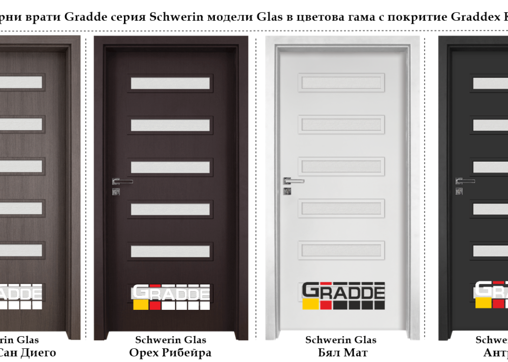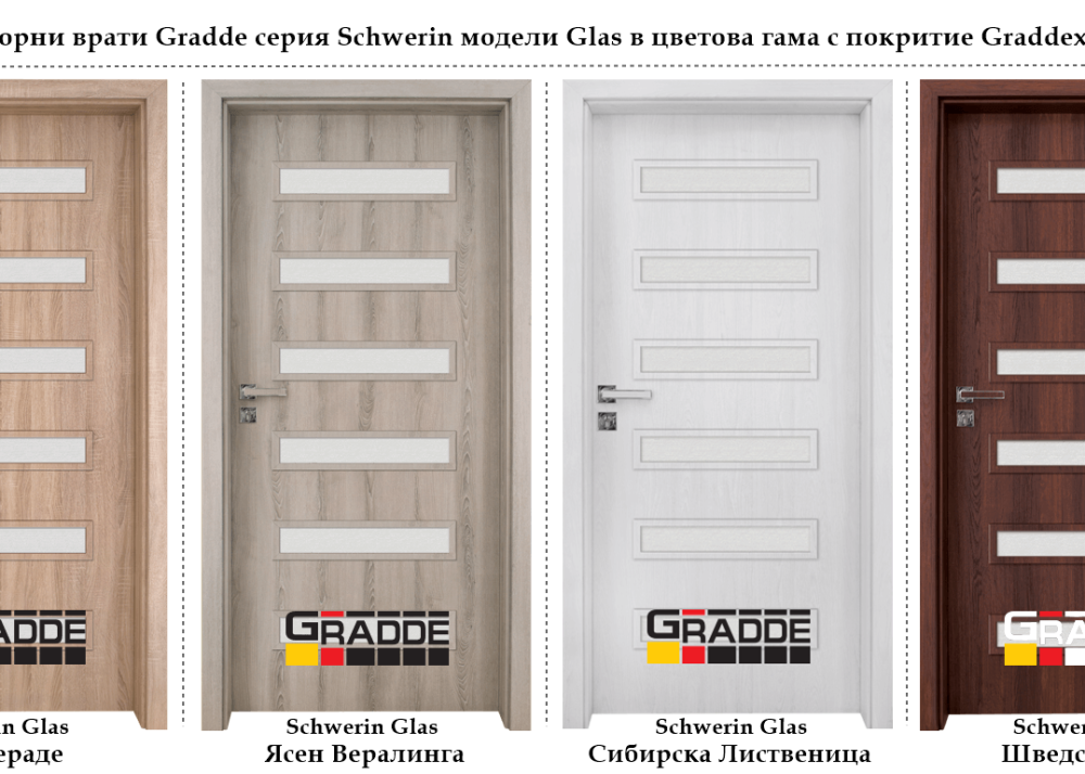 Интериорни врати Gradde серия Schwerin включва качествени модели с остъклени крила Glas и модели с плътни крила Voll, красиви модели в отличаващ се дизайн и цветова гама.