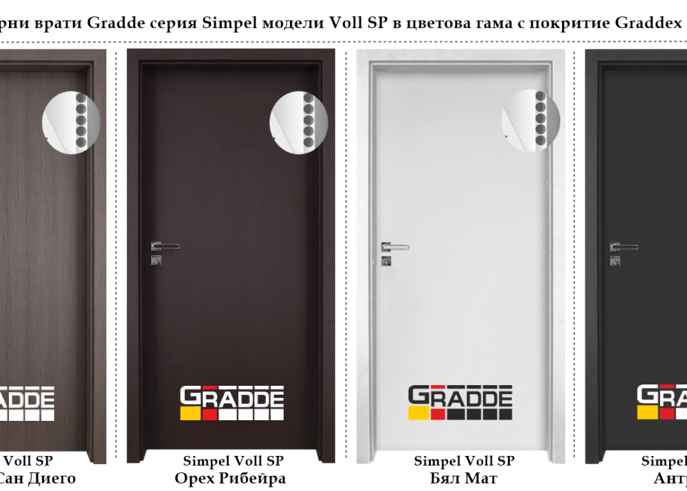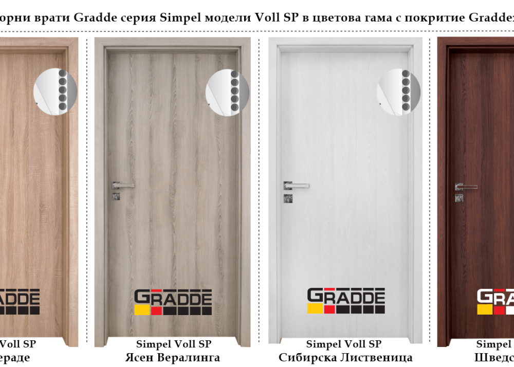 Моделите интериорни врати Gradde от серия Simpel се изпълняват в два варианта на крилата, с плътни крила Simpel Voll с пълнеж тип „пчелна пита“ и плътни крила Simpel Voll SP с пълнеж „перфорирано ПДЧ“. И в двата варианта крило Simpel Voll и крило Simpel Voll SP се изработват с два вида покрития Graddex Klasse A и Graddex Klasse A++, в 8 цвята подходящи за съчетанието с всеки интериор.