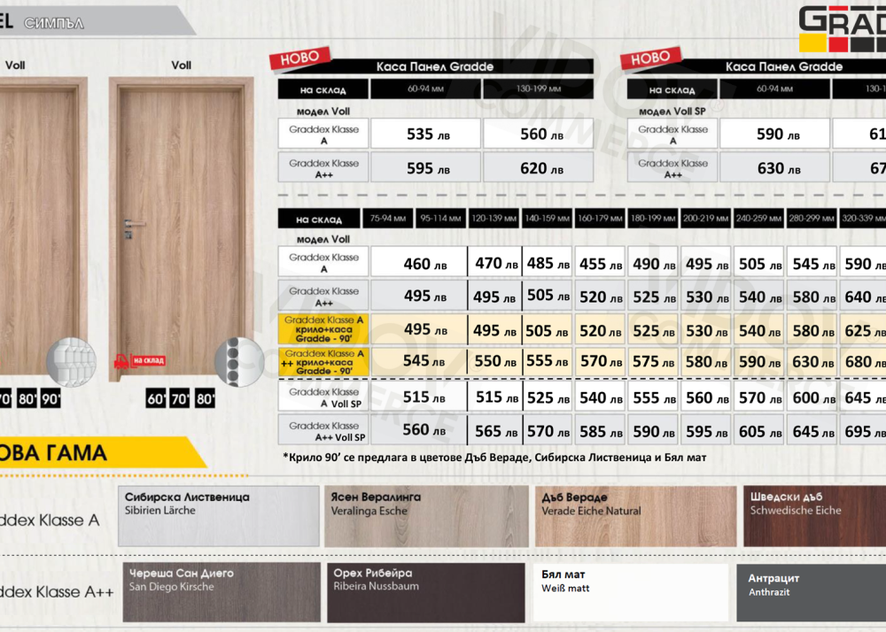 Подробни цени за всички модели интериорни врати Gradde от серия Simpel, с двата вида каси и двете цветови гами .