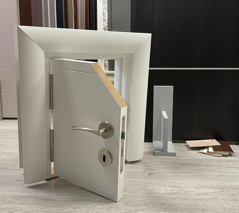 Плътно крило с релефна фрезовка (в 4 размера, по-избор без оскъпяване), регулируема каса (в 4 размера, по-избор без оскъпяване) и 8см прави плаващи первази, гумено уплътнение, 3бр. иноксови панти, иноксова брава (стандартна, секретна или WC – по избор), ключове, крепежни елементи.