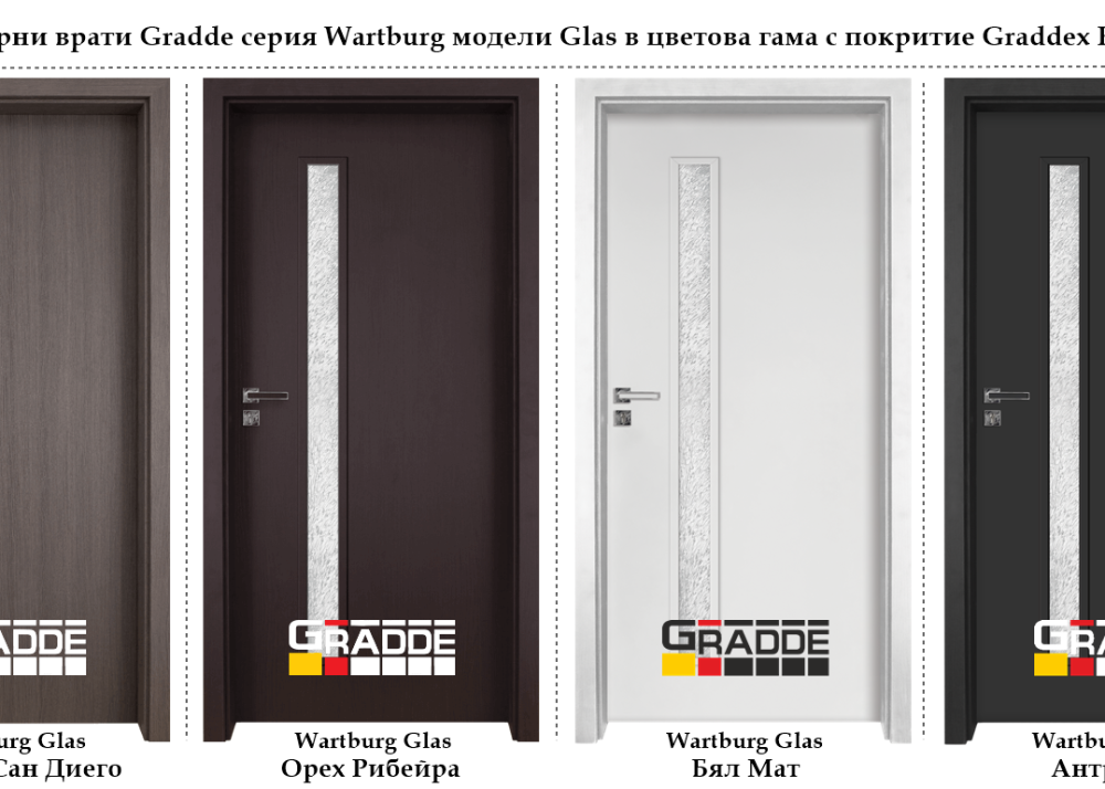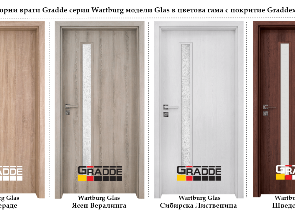 Интериорни врати Gradde серия Wartburg включва качествени модели в отличаващ се дизайн и цветова гама, модел с остъклено крило Glas и модел с плътно крило Voll.