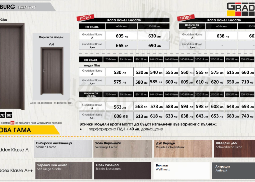 Магазин за врати VIDOV COMMERCE, предлагаме най-големите отстъпки при поръчка на голям брой врати Gradde. За строителни фирми, хотели, кооперации, за юридически лица или физическо лице, ще изготвим най-изгодната оферта.