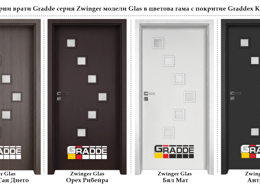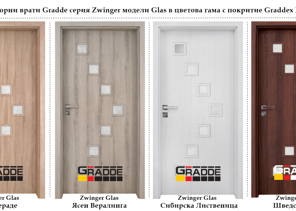 Интериорни врати Gradde серия Zwinger включва качествени модели с остъклени крила Glas и модели с плътни крила Voll, различни модели в отличаващ се дизайн и цветова гама.