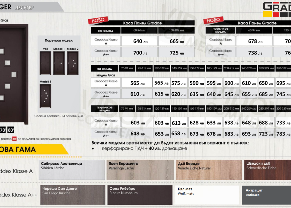 Забележка ! В посочените цени НЕ СА ВКЛЮЧЕНИ – дръжки ! Поради огромния избор от различни модели дръжки Gradde, всеки клиент има възможността да избере предпочитания модел дръжки и брави.