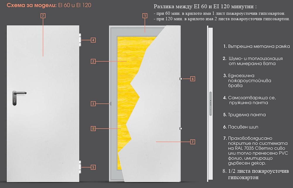 Структурата на еднокрилите и двукрилите крила е еднакво – подсилена оребрена метална рамка облечена с два поцинковани стоманени листа с дебелина 0.9мм. Сърцевината е запълнена с огнеустойчива каменна минерална вата, като е добавен допълнително за EI 60 един лист пожароустойчив гипсо картон, а за EI 120 два листа. Крилата са с покритие от топлопренесено PVC фолио с дебелина между 120 и 200 микрона, имитиращо дървесен декор. Дебелината на крилата са по 6см с фалц.