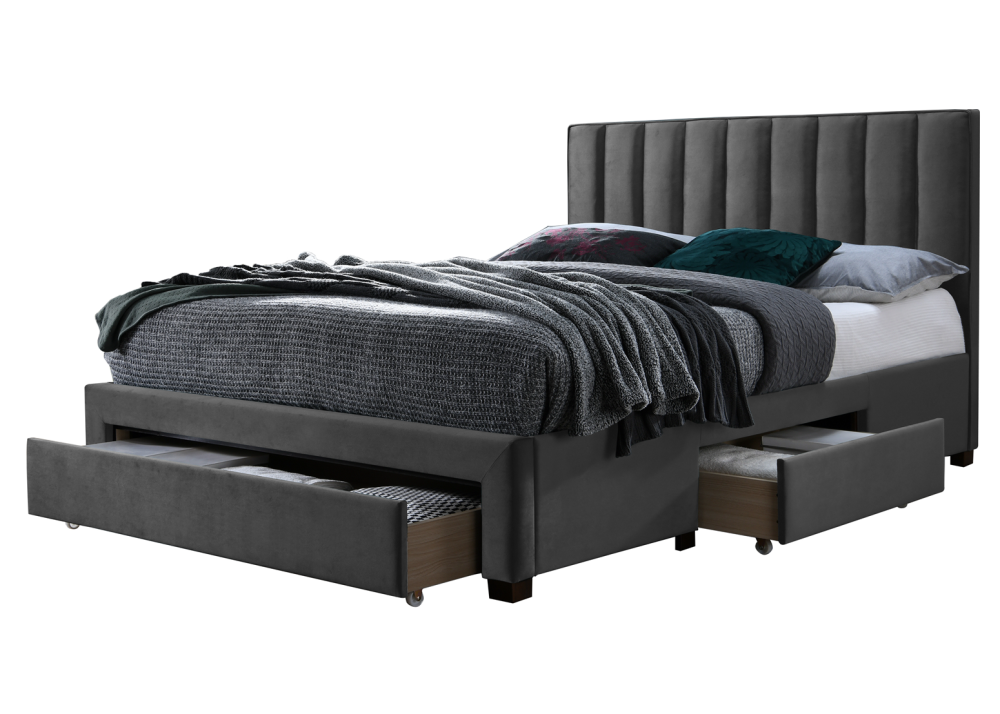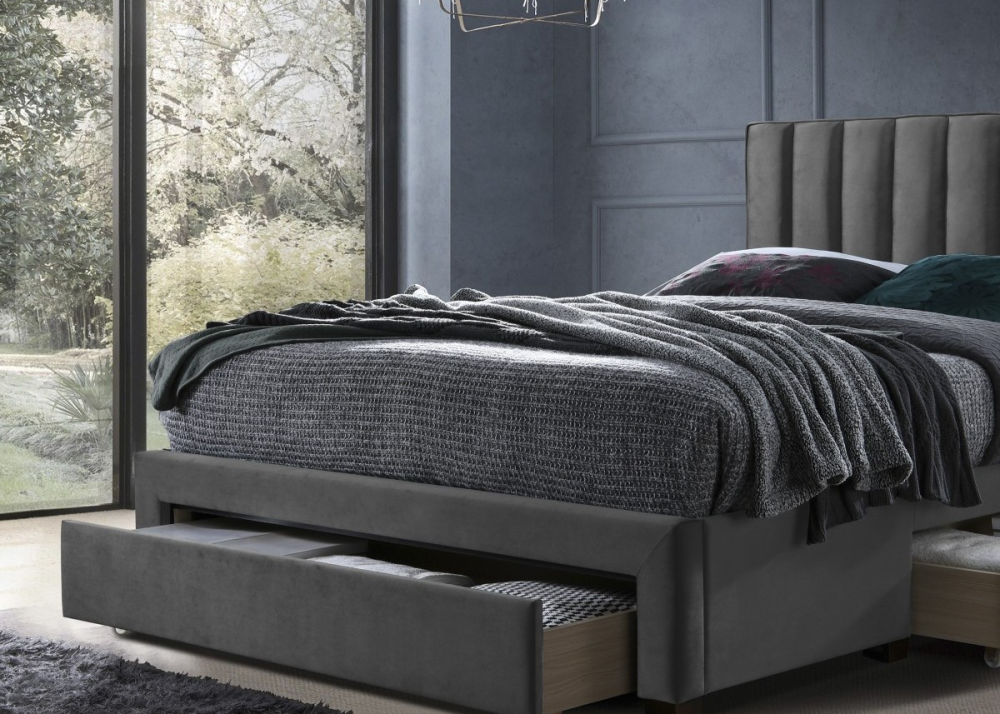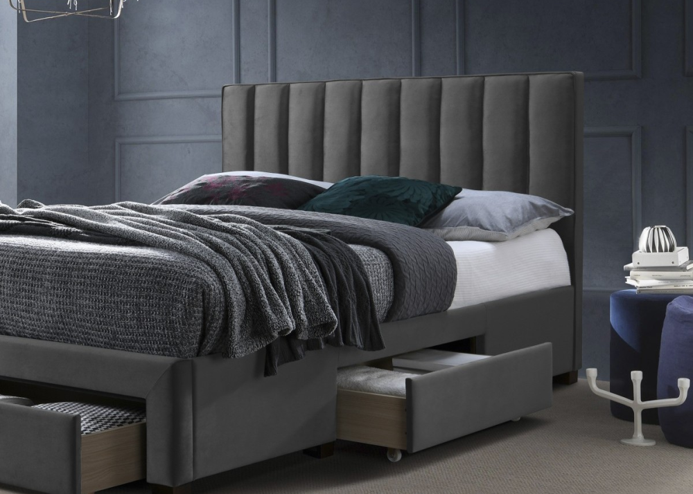 Тапицирана спалня GRACE в сив цвят впечатлява с елегантна капитонирана табла, основа и три практични чекмеджета. Моделът е тапициран с висококачествена кадифена дамаска и се предлага в комплект с подматрачна рамка за матрак 160/200 см. Чекмеджетата са оборудвани с колелца за удобно и плавно отваряне – перфектен избор за стил, комфорт и функционалност в спалнята.