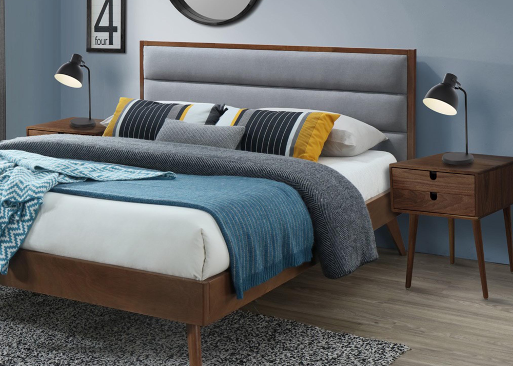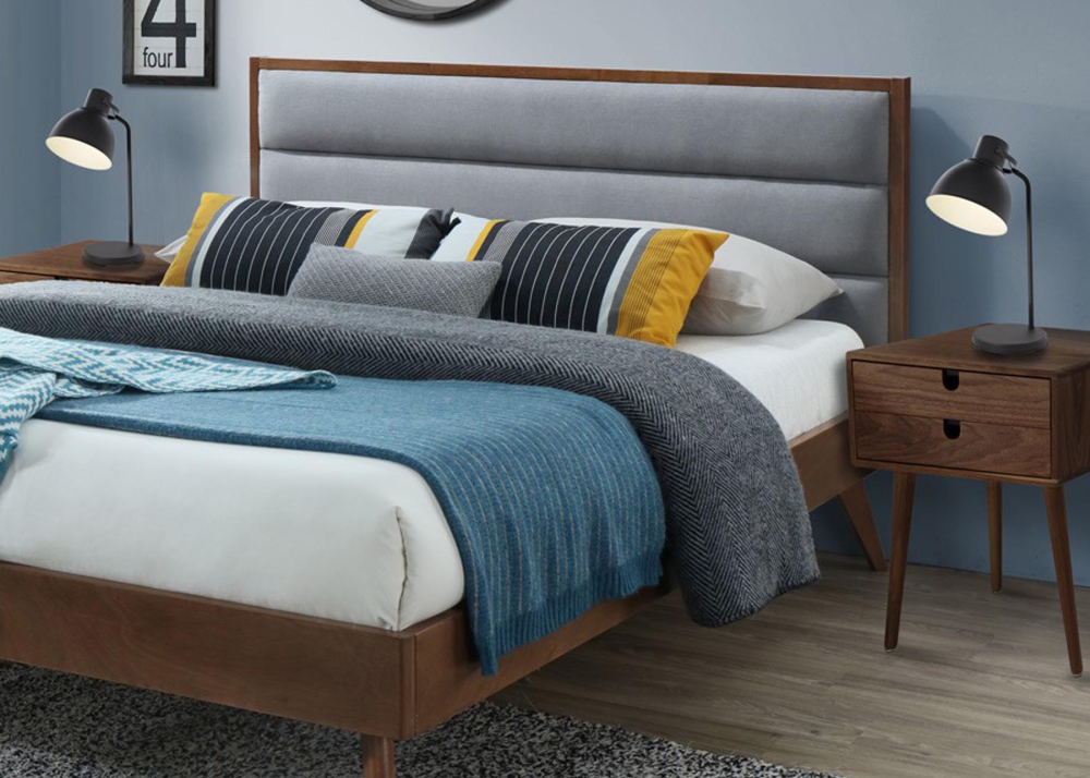 Спалня Orlando се изработва от качествени и устойчиви материали. Основата, крачетата и таблата се изработват от масивно каучуково дърво. Таблата на този модел спалното легло, е тапицирана с качествен и устойчив плат в модерен дизайн в сив цвят. Снабдено е с дървена подматрачна рамка.