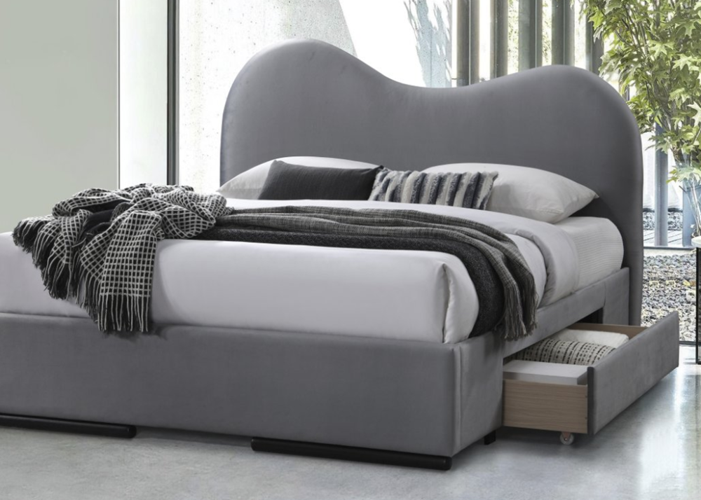 Тапицирано легло Amber в сиво цвят с модерна капитонирана табла и основа с две чекмеджета, в комплект с подматрачна рамка.