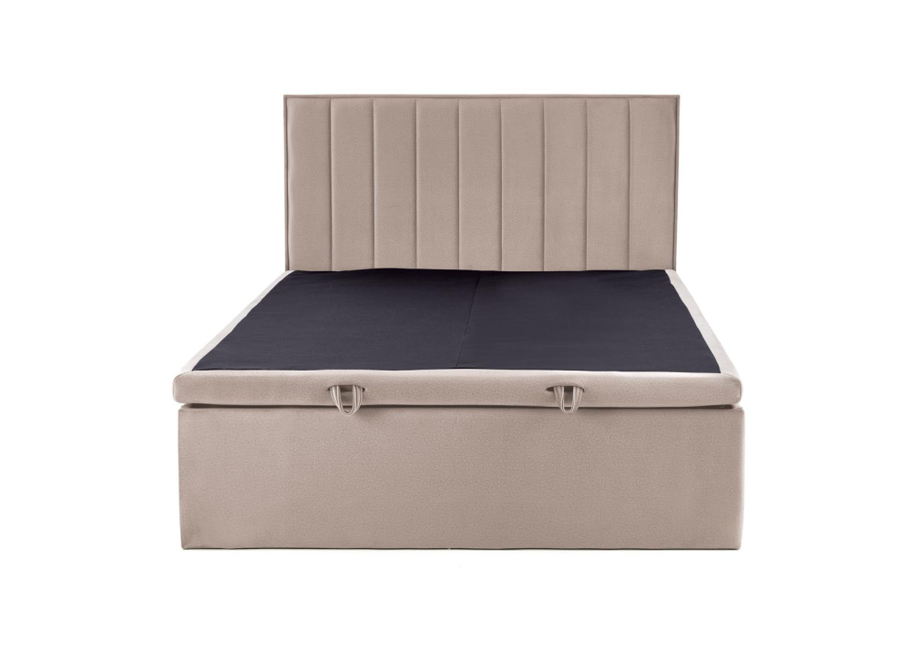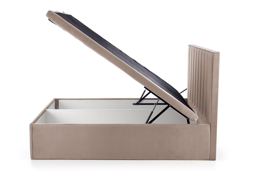 Моделът е окомплектован готов вариант, включващ здравa MDF основа и масивна дървесна конструкция с ламинирано дъно, повдигаща се метална подматрачна рамка с дървени ламели и газови амортисьори. Благодарение на просторно подматрачно отделение, леглото осигурява практично място за съхранение на спално бельо, завивки и вещи, съчетавайки функционалност и модерен дизайн.