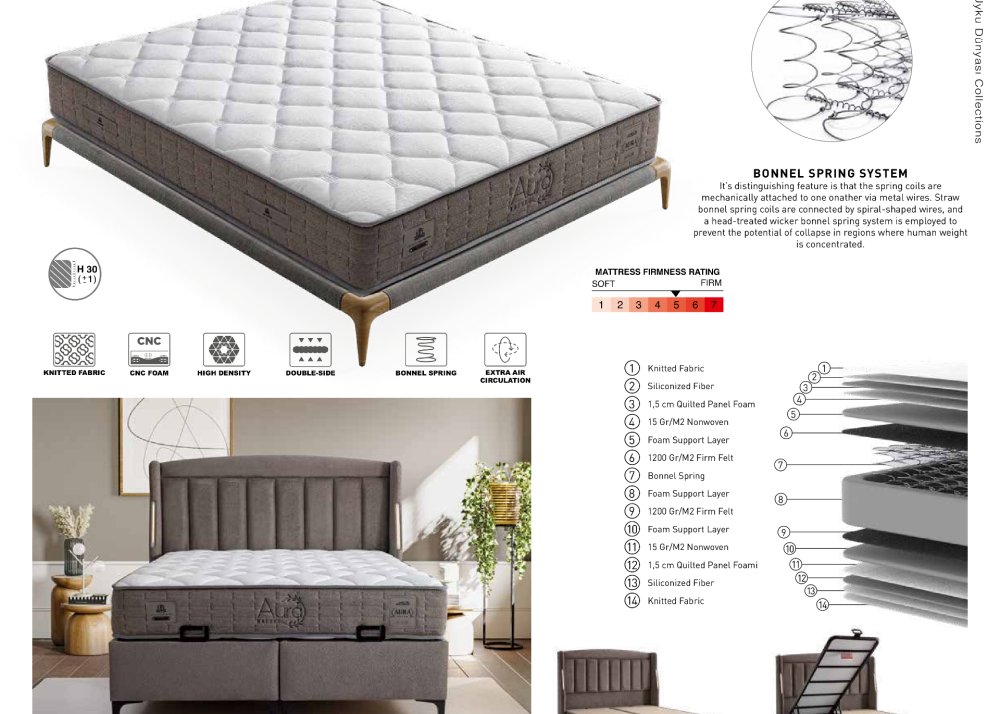 • Матрак Aura е с ядро от Bonel Spring пружинна система обвита с борд от дунапрен с висока плътност и допълнителни омекотяващи слоеве от дунапрен и HR пяна.