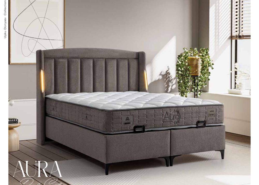 Тапицирано легло Aura в цвят кварцово сиво включва модерна капитонирана табла с вградено LED осветление и основа с повдигаща се подматрачна система с газови амортисьори. Предлага се с опция за покупка без матрак или в комплект с матрак Aura.