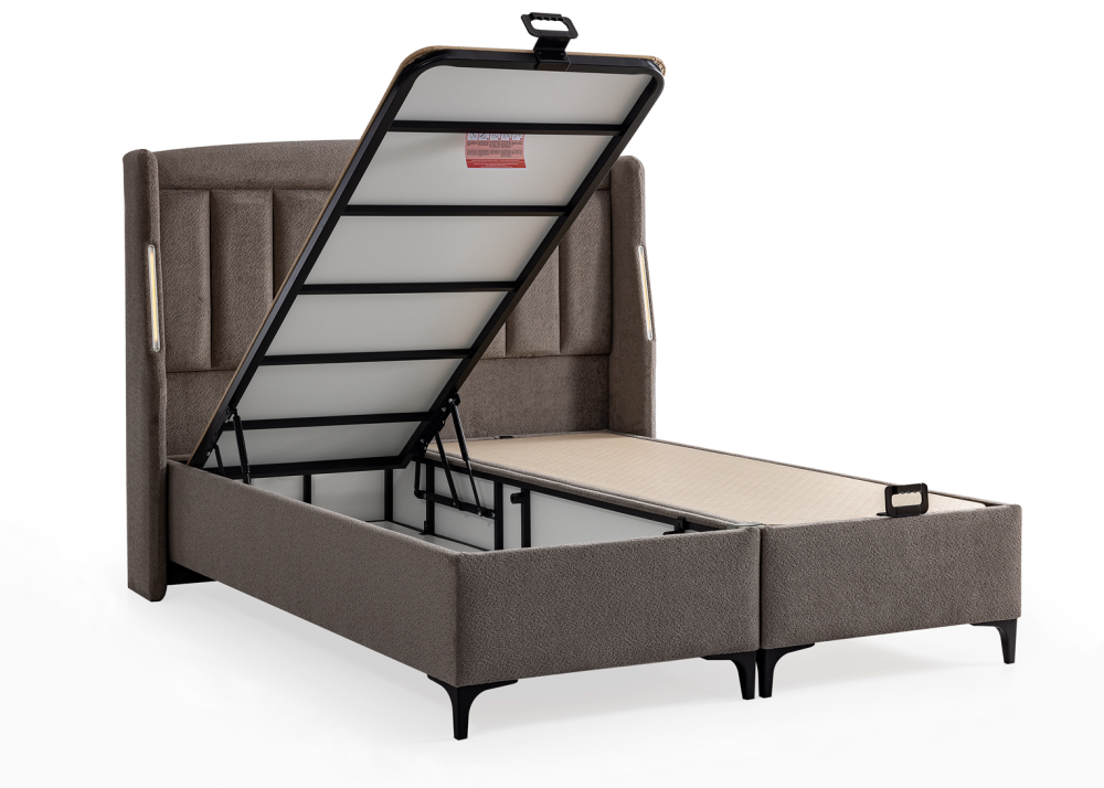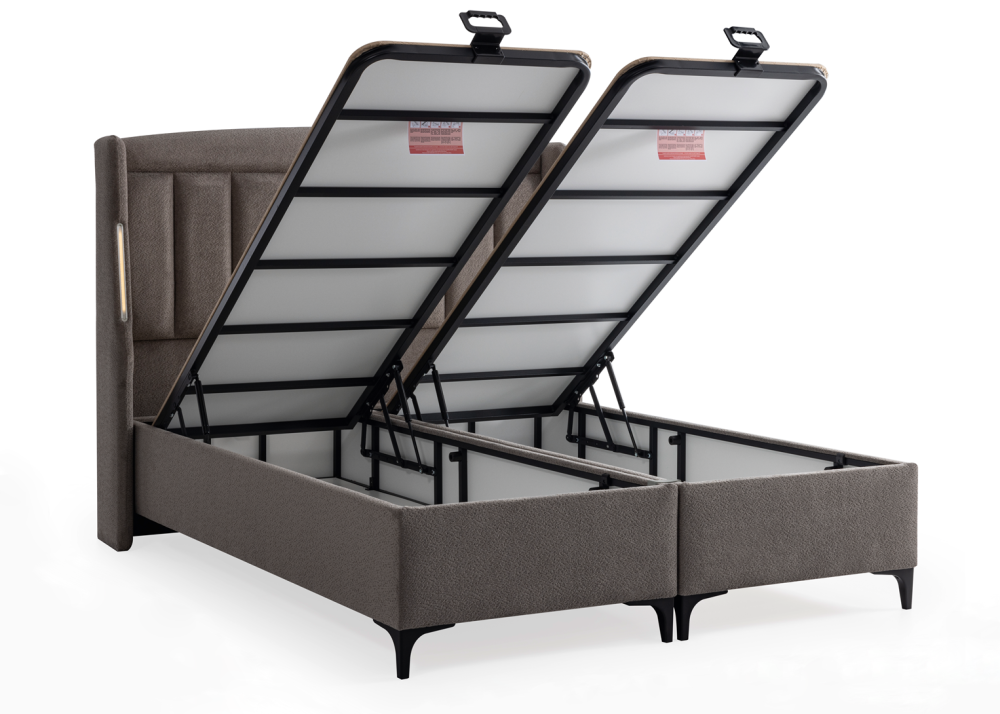 Тапицирано легло Aura е модулен и напълно окомплектован модел, който се състои от модерна капитонирана табла с вградено LED осветление и основа с вградена повдигаща подматрачна система с газови амортисьори, осигуряваща удобно място за съхранение на завивки, спално бельо и други вещи.