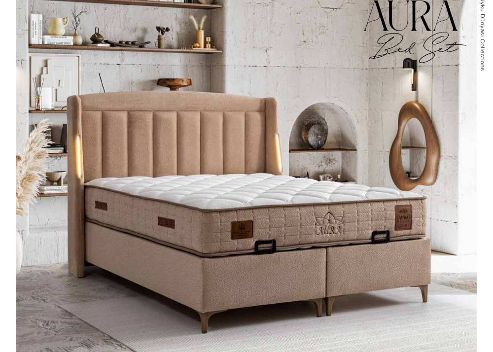 Тапицираното легло Aura е част от колекцията на мебели Uyku Dünyasi съчетава модерен дизайн, безкомпромисно качество и практична функционалност и е идеален избор за елегантно и уютно обзавеждане.