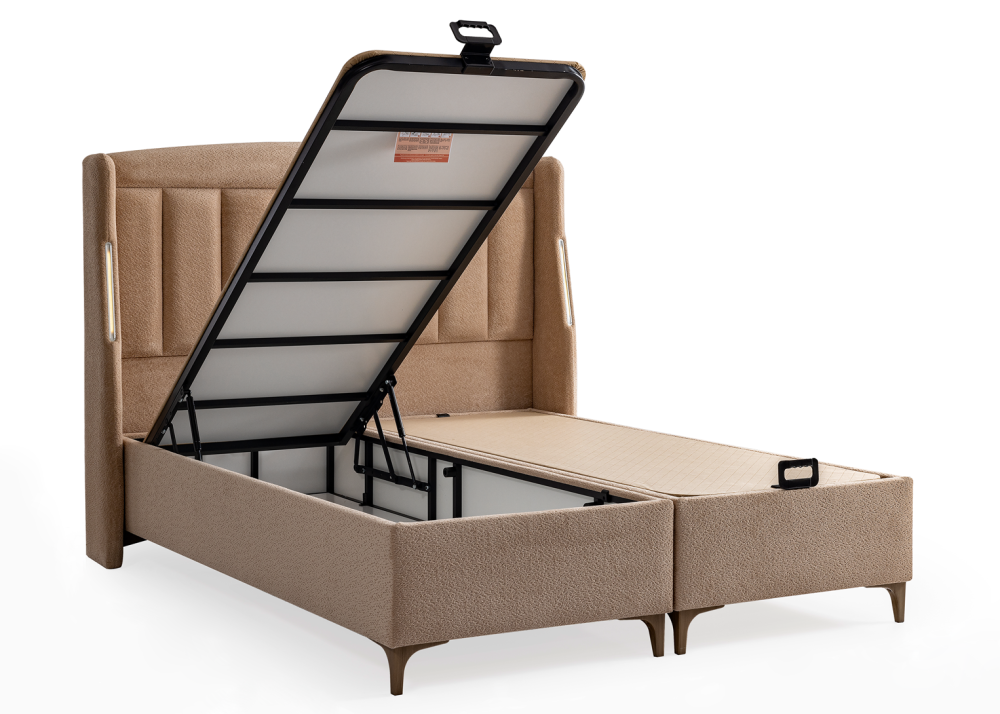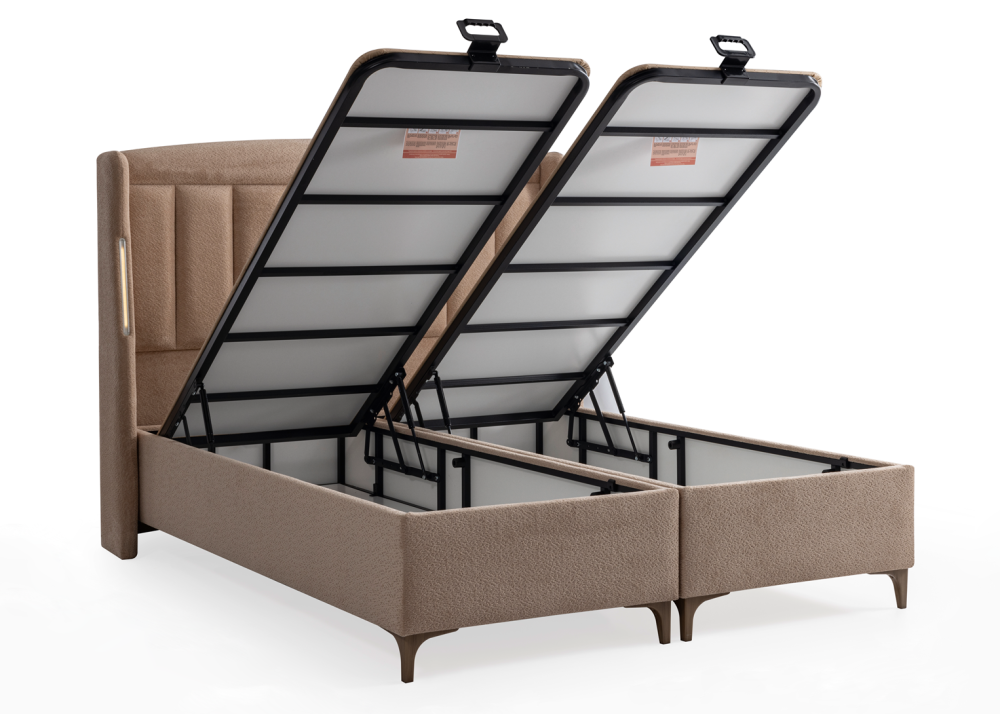 Тапицираното легло Aura в цвят Кафява Охра впечатлява с модерна капитонирана табла, в която е вградено LED осветление, придаващо стилна атмосфера и допълнителен комфорт. Леглото разполага с основа с вградена повдигаща се подматрачна система с газови амортисьори, която предлага просторно място за съхранение на завивки, спално бельо и други вещи. Моделът е капитониран с висококачествена мека дамаска TROYA 03, която осигурява уют и модерен стил, подходящ за всяка съвременна спалня.