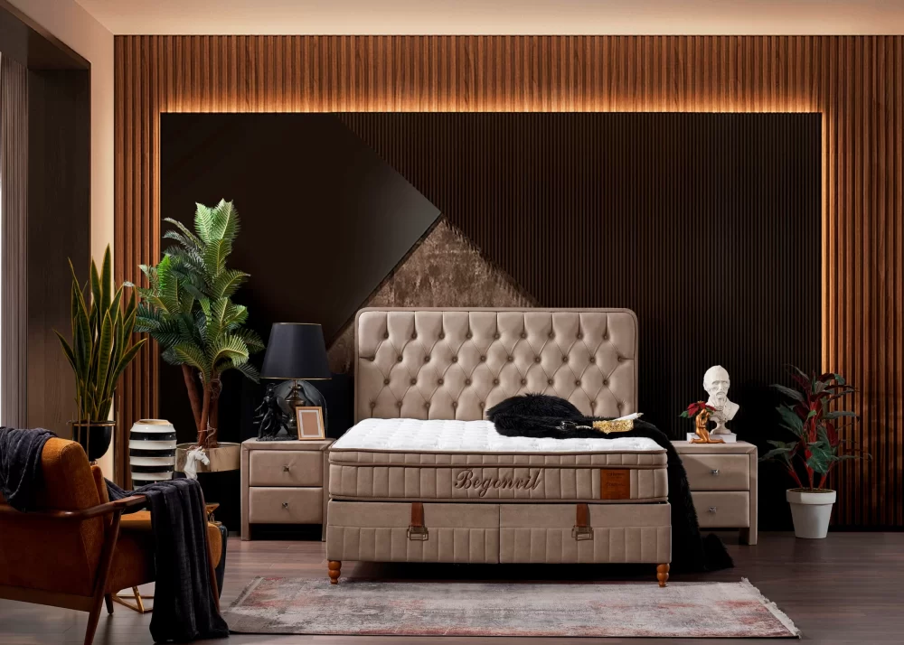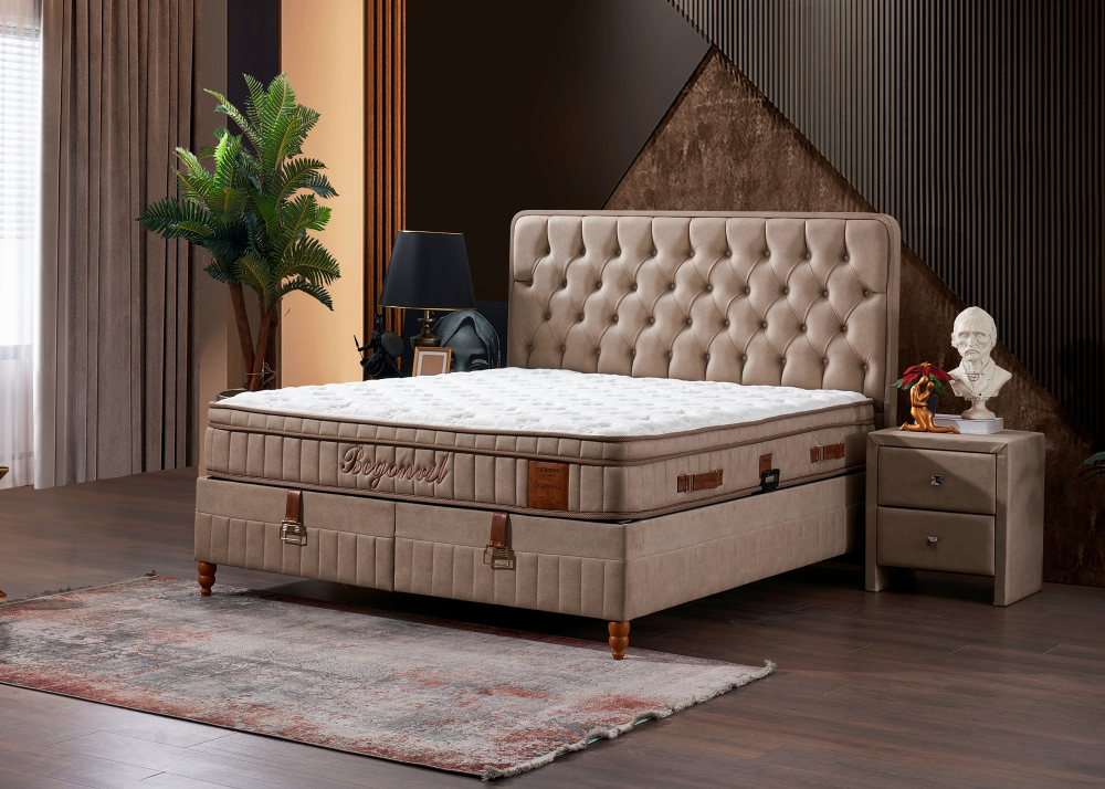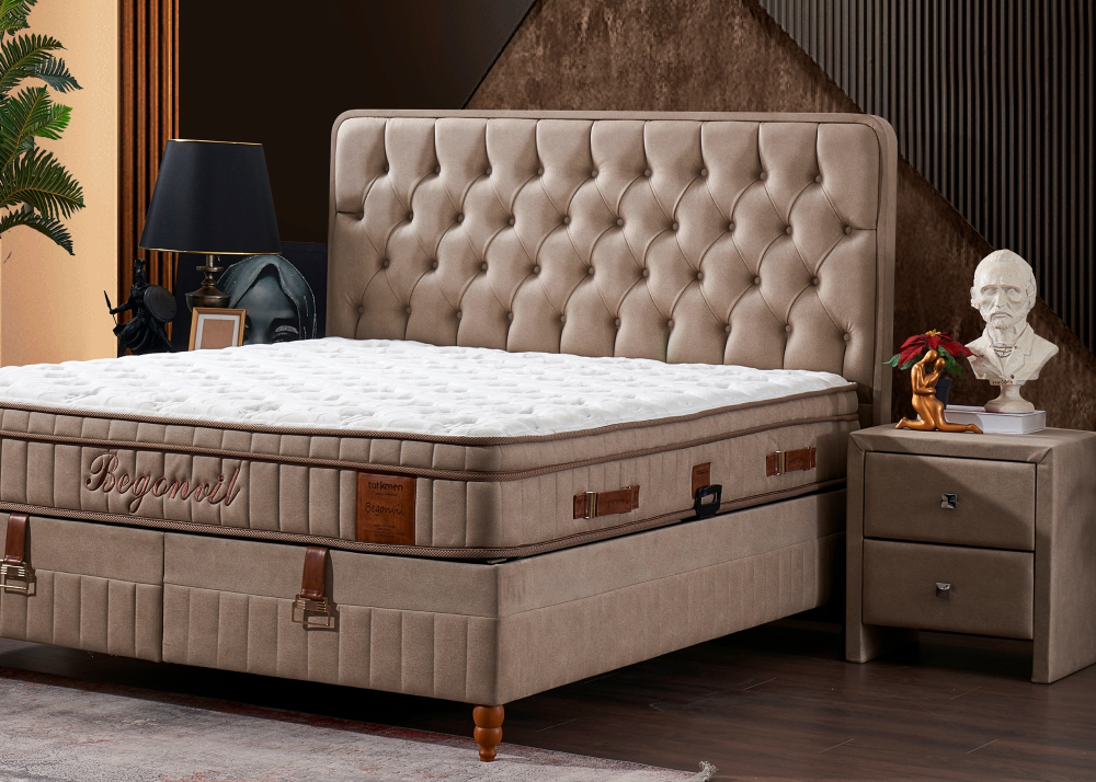 Тапицирано легло Begonvil е модулно, готов окомплектован вариант, който се състои се от капитонирана табла и капитонирана основа с повдигаща подматрачна система.