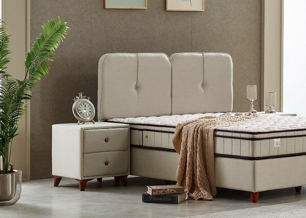 Тапицираното легло Bodrum впечатлява с модерна визия в цвят Светло бежов, съчетан с елегантна капитонирана табла и основа. Моделът е снабден с повдигаща се подматрачна рамка с газови амортисьори, която осигурява допълнително пространство за съхранение – идеално решение за практично и стилно обзавеждане на всяка съвременна спалня.