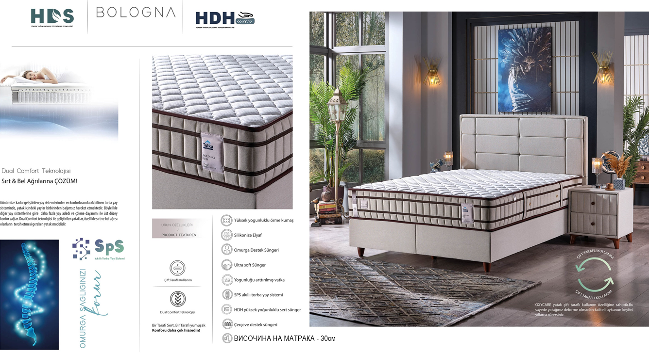 - Матрак Bologna притежава Dual Comfort система, две страни на различено усещане за твърдост. От едната страна е мек а от другата твърд.