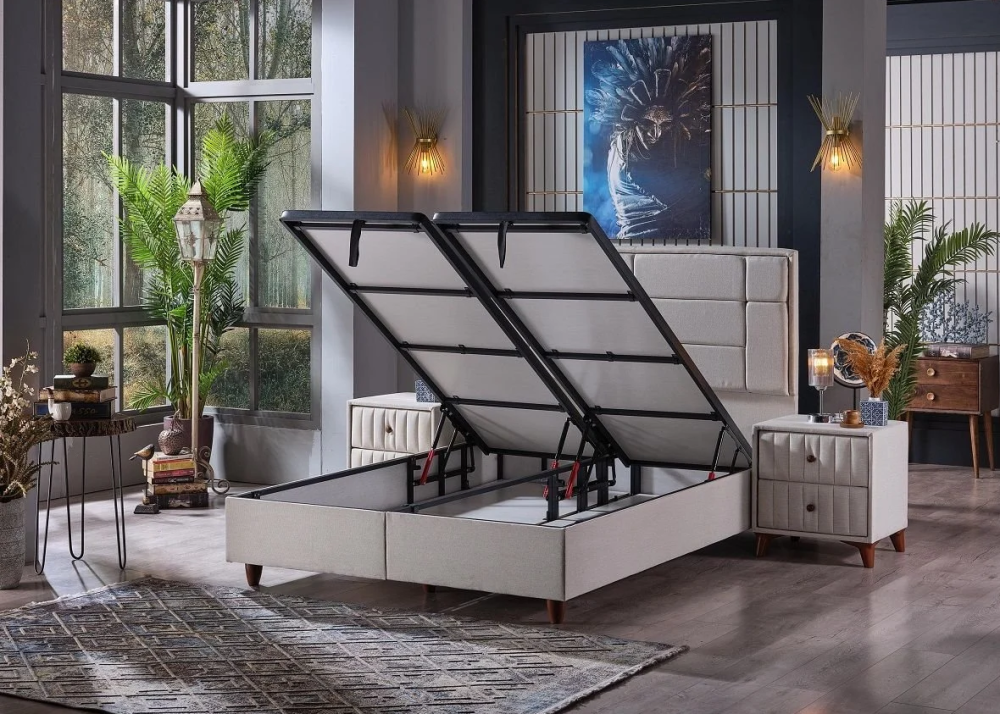 - Базата е снабдена с дъно и нов модел повдигаща система от 1бр / 2бр метална подматрачна рамка с цял ламиниран ПДЧ панел. Рамката е оборудвана с 2бр / 4бр газови амортисьори /2х2/ по 750N, може да се повдига всяка основа по отделно или заедно, има спирачка на механизма, която може да се ползва когато механизма е отворен. На дъното и рамката са монтирани вентилационни капачки. Основата предоставя голямо празно подматрачно пространство, подходящо за съхранение на спални завивки и други вещи.