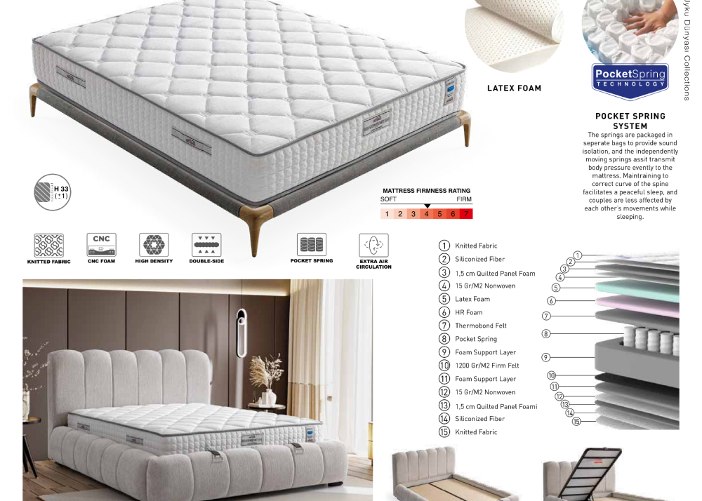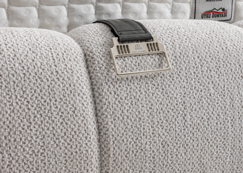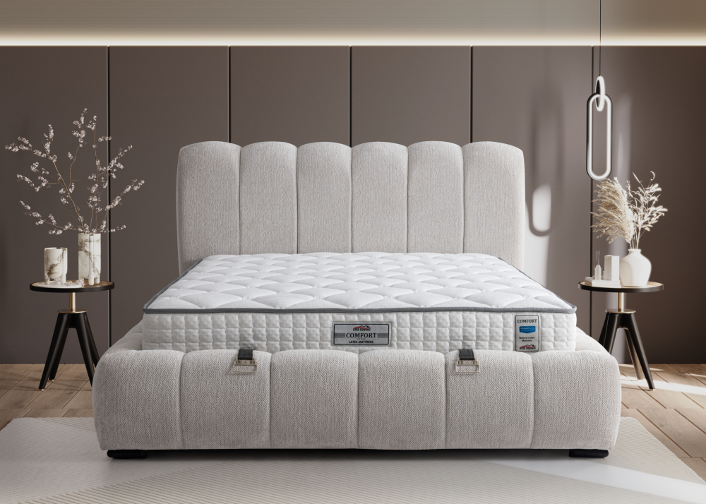Тапицираното спално легло Comfort Uyku Dünyasi разполага с луксозна капитонирана табла и тапицирана основа, в която са вградени елегантни кожени дръжки, улесняващи повдигането на подматрачните рамки. Основата е снабдена с вградена повдигаща се подматрачна система с газови амортисьори, която осигурява просторно и практично място за съхранение на завивки, възглавници, спално бельо и други вещи.