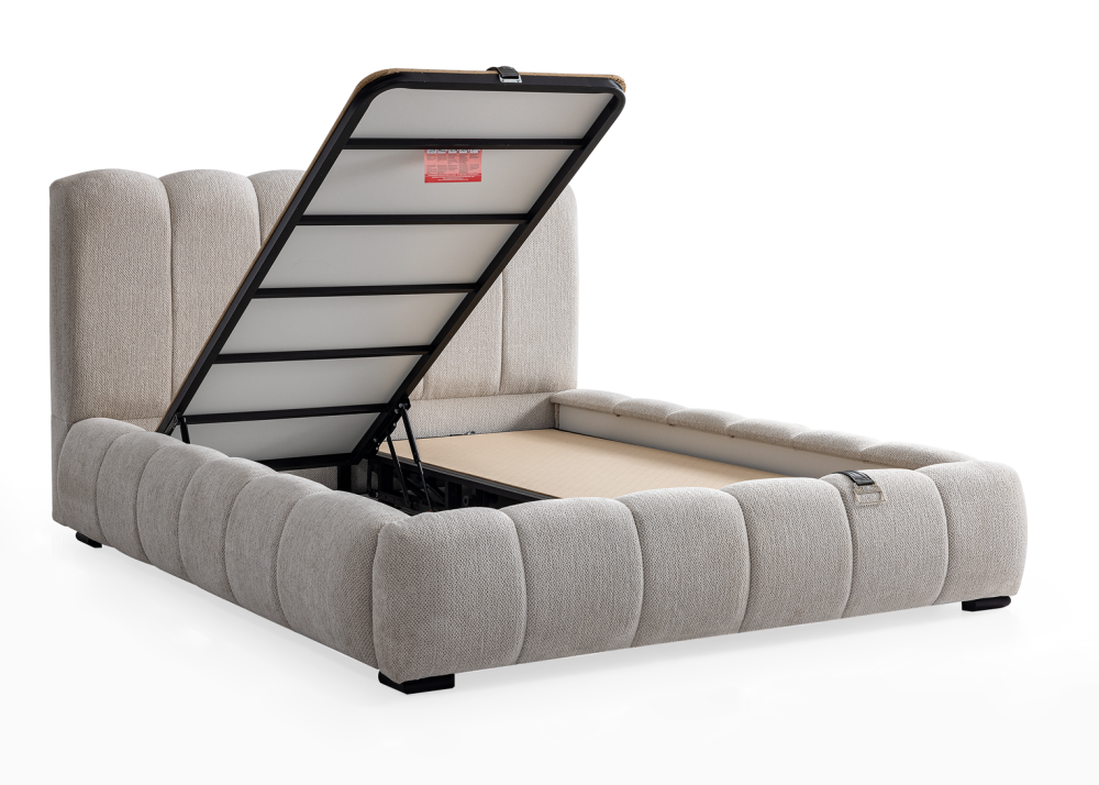 Тапицираната основа е с елегантен акцент от кожени дръжки, които улесняват отварянето на вградената подматрачна система, оборудвана с повдигащ механизъм и газови амортисьори. Те осигуряват лесен и безпроблемен достъп до просторната вътрешна зона за съхранение, идеална за завивки, възглавници, спално бельо и други вещи, които трябва да бъдат подредени практично и дискретно.