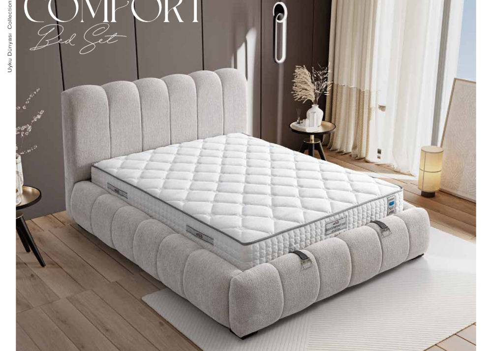 Тапицираното легло Comfort Uyku Dünyasi част от колекцията на мебели Uyku Dünyasi съчетава модерен дизайн, безкомпромисно качество и практична функционалност и е идеален избор за елегантно и уютно обзавеждане.